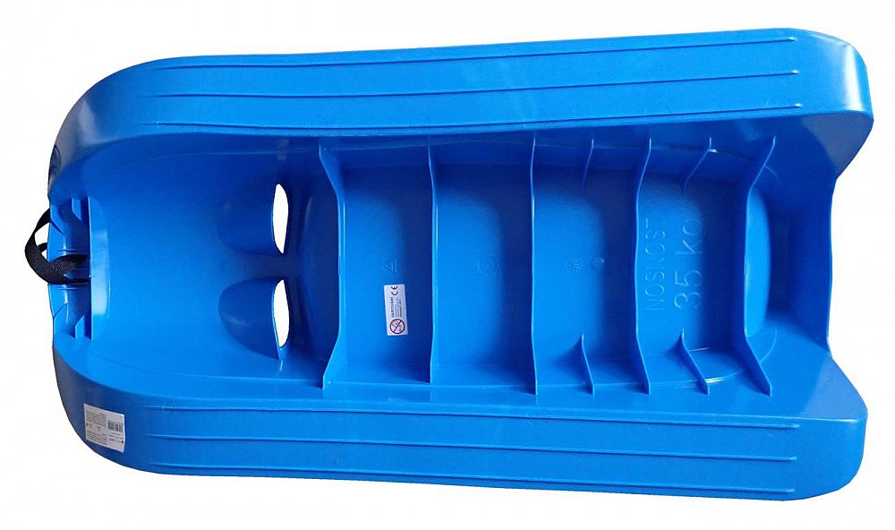 Sáně plastové ALFA, popruh, určeno pro rekreační sport. Vhodné pro menší děti, saně mají v přední části dutiny na držení při jízdě. Délka saní je 88 cm a šířka, včetně stupátek, činí 42 cm. Nosnost 40 kg. K dispozici v barvě modré, viz foto.