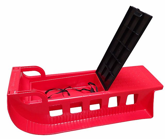 Sáně plastové KAMZÍK s popruhem na tahání a úložným prostorem v sedátku, určené pro rekreační sport.