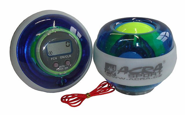 Wrist ball - posilovací koule. Výrobek má za účel posilování prstů, zápěstí, předloktí i celé ruky, včetně bicepsu a tricepsu. Pro lepší přehled o cvičení je tento model Wrist ballu doplněný computerem, s několika funkcemi. Dále má Wrist ball efekt svícení. Jedná se o univerzální posilovací i rehabilitační pomůcku. Jako rehabilitační pomůcka wrist ball slouží pro uvolnění po dlouhotrvající práci na počítači - hlavně na klávesnici a s myší. Využívá se též k rehabilitaci "tenisového lokte", což jsou namožené vazy v předloktí a k prevenci před syndromem karpálního tunelu - stahování šlach v dlani a bolesti rukou. Umožňuje libovolně si určovat dobu a náročnost cvičení, pomocí krouživého pohybu rukou, nebo pouze zápěstím. Vše závisí na tom, k jakému účelu wrist ball chcete používat a podle toho, si přizpůsobíte režim cvičení. Tento model má průměr 7 cm, hmotnost 260 g a díky své zvýšené hmotnosti oproti základnímu modelu je vhodný pro kondiční formu cvičení. Princip cvičení spočívá v roztáčení vnitřní variabilně otočné vnitřní části, krouživým pohybem zápěstí nebo ruky. Zvyšujícími se otáčkami vnitřní koule dochází ke zvyšování odporu a tím i celkové zátěže pro cvičení. Při otáčení vnitřní koule u tohoto modelu svítí. Zdokonalováním ovládání dojde i ke zvýšení efektivnosti cvičení. Wrist ball je po obvodu opatřený gumovým páskem pro lepší držení při cvičení. Vnitřní kovovou kuli je možné roztočit rychlostí až 12.000 otáček za minutu a docílit odporové síly přes 16 kg. Balení je v potištěné krabičce s přiloženým návodem k použití. Computer má následující funkce : rychlost otáčení, nejvyšší docílená rychlost otáčení, počet otáček celkem, počet otáček za zvolený časový úsek - např. za 30 sec.Hodnocení produktu zákazníky Wrist ball (posilovací koule) s computerem D32