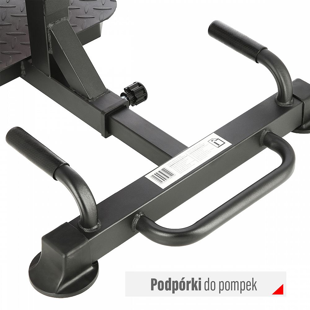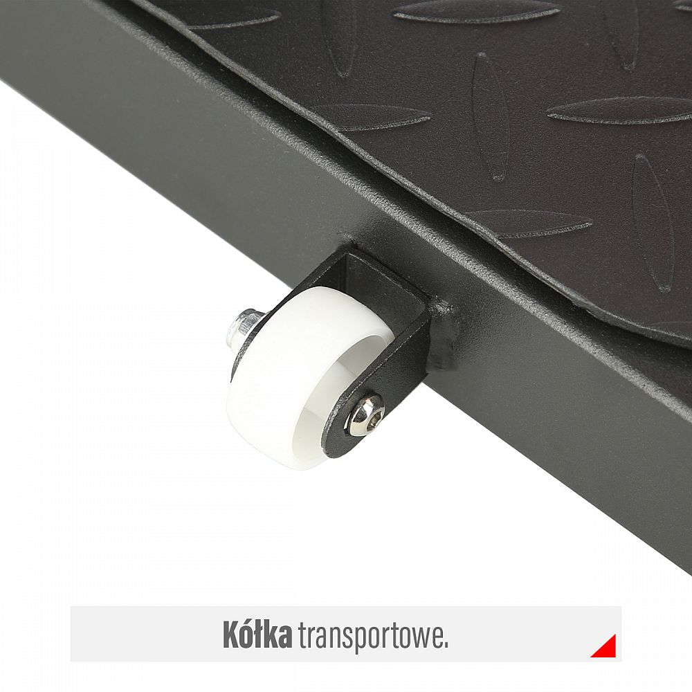 Robustní ocelová konstrukce stojí na plastových koncovkách, které chrání podlahu před poškozením a zároveň zajišťují vysokou stabilitu lavice. Přední stabilizátor je osazen transportními kolečky, zatímco zadní stabilizátor je opatřen uchem pro snadné přesunutí lavice, pokud ji zrovna nepoužíváte. Zadní část rámu jde zasunout, aby lavice zabírala opravdu minimum místa. Platforma je vyrobena z drážkovaného plechu, který zamezuje klouzání bot. Na polstrování je použita hrubá deska, s vysokou vrstvou PU pěny pro maximální komfort, PU pěna je také použita na zarážky nohou.