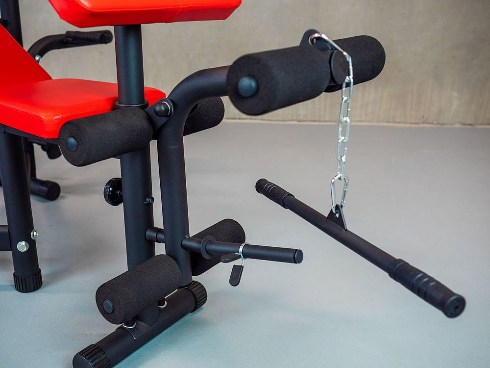 - Na nohy je určena kladka umožňující procvičení stehen a lýtek. Tato kladka umožňuje také rozmanité cviky na ruce díky řetízkem propojené otočné hřídeli.