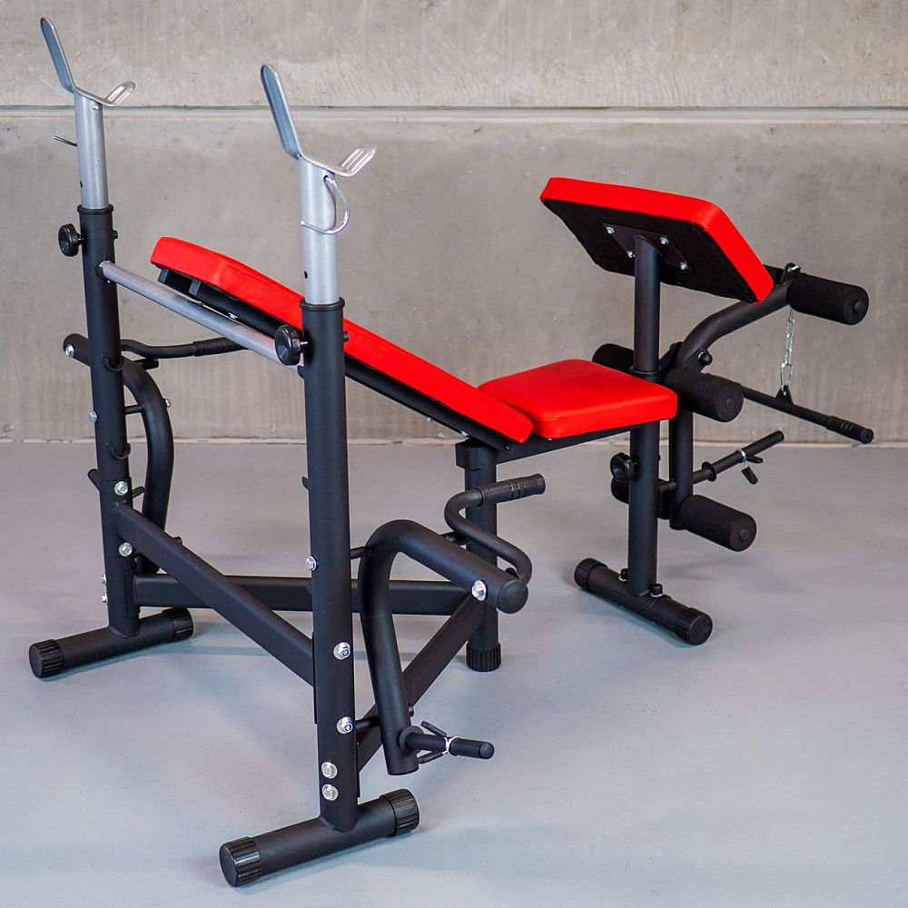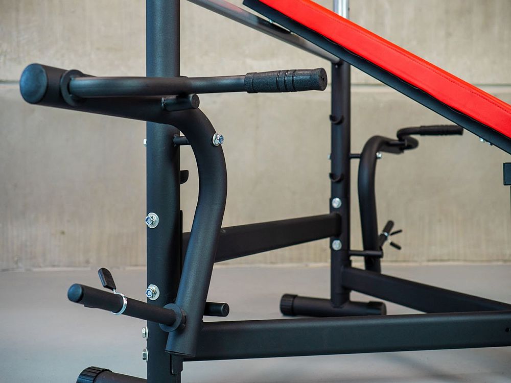 - Nosné části lavice a stojanu jsou ze silnostěnných trubek o průměru 60 mm. Středová rozteč stojanu na činku je 101 cm – 95 cm vnitřní, 107 cm vnější rozteč.