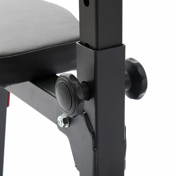 Konstrukce lavice MARBO MH-L105 2.0 je vyrobena z ocelového profilu 40 x 40 mm, díky kterému má nosnost až 250 kilogramů. Jednotlivé díly jsou vyrobeny na precizních, programovatelných CNC strojích, tento výrobní proces je zárukou bezproblémové montáže a zároveň garantuje plnou stabilitu kompletní lavice. Opěra je nastavitelná do 5-ti úrovní a dokážete si ji tak perfektně přizpůsobit své výšce. Regulace se provádí pomocí šroubů s plastovým, ergonomickým úchytem. Háky pro odložení činky jsou opatřeny hrubou gumou, která chrání jak činku, tak konstrukci před poškrábáním. Polstrování je vyrobeno z hrubé, syntetické kůže a je ergonomicky tvarované. Jednotlivé díly jsou k sobě spojeny dvojitými švy pro maximální pevnost.
