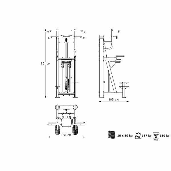 Multifunkční hrazda s dopomocí MARBO MP-U231 je nekompromisní, profesionální vybavení pro Vaší posilovnu. Pro výrobu byly zvoleny ocelové profily 120x60x3mm a 80x40x3mm, které zaručují nečekanou trvanlivost. Zátěž tvoří 10ks 10kg cihel. Celková váha závaží dodávána se strojem je tedy 100kg. Stroj disponuje dvěma nášlapy z drážkovaného plechu o rozměrech 32x17cm a každý je v jiné výšce. Jejich umístění a rozměr minimalizují riziko poranění, ale usnadňují výstup do pracovní pozice. Polstrovaní je ze syntetické kůže sešité režnou nití značky COATS vyplněné tvrdou pěnou, to celé ja na 3mm hrubé, ocelové desce. Tichý chod zajištuje zakrytování černým plastem, z přední části je kryt opatřen průhledem pro snadné nastavení požadovaného počtu cihel. Stroj je navíc opatřen velikou samolepkou, která instruuje cvičence, jaké cviky jdou na stroji provádět a které skupiny svalů daný cvik posiluje.