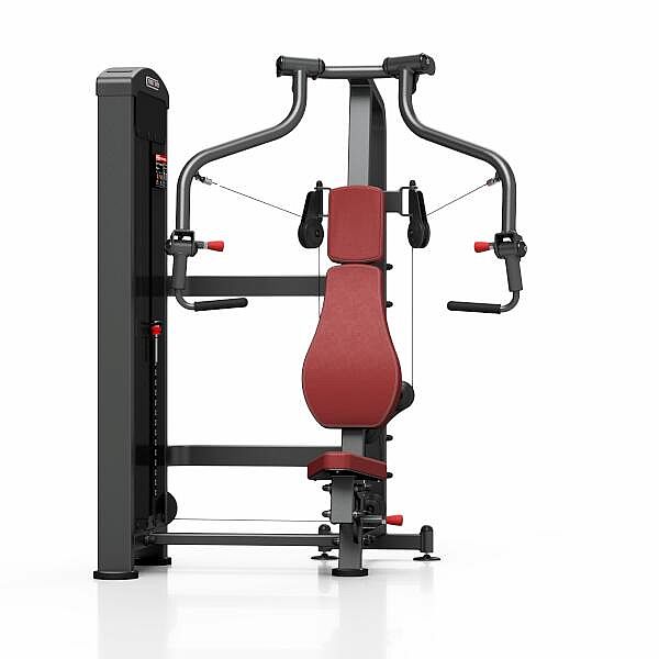 Stroj pro posílení prsních svalů MARBO MP-U225 je nekompromisní, profesionální vybavení pro Vaší posilovnu. Pro výrobu byly zvoleny ocelové profily 120x60x3mm a 80x40x3mm, které zaručují nečekanou trvanlivost. Zátěž tvoří 16ks 10kg cihel. Celková váha závaží dodávána se strojem je tedy 160kg. Ramena mají na sobě nezávislý chod. To zaručuje vysokou efektivitu tréninku. Veškeré nastavení se provádí červenými, pneumatickými kolíky. Sedadlo má čtyři polohy, ramena mají tři polohy. Polstrovaní je ze syntetické kůže sešité režnou nití značky COATS vyplněné tvrdou pěnou, to celé ja na 3mm hrubé, ocelové desce. Tichý chod zajištuje zakrytování černým plastem, z přední části je kryt opatřen průhledem pro snadné nastavení požadovaného počtu cihel. Stroj je navíc opatřen velikou samolepkou, která instruuje cvičence, jaké cviky jdou na stroji provádět a které skupiny svalů daný cvik posiluje.