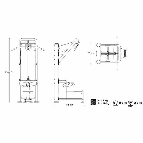 Horní kladka MARBO MP-U206 je nekompromisní, profesionální vybavení pro Vaší posilovnu. Pro výrobu byly zvoleny ocelové profily 120x60x3mm a 80x40x3mm, které zaručují nečekanou trvanlivost. Zátěž tvoří 8ks 5kg a 8 ks 10kg cihel. Celková váha závaží dodávána se strojem je tedy 120kg. Tichý chod zajištuje zakrytování černým plastem, z přední části je kryt opatřen průhledem pro snadné nastavení požadovaného počtu cihel. Kladka je ve výšce 230cm a tak mohou na stroji cvičit i jedinci o výšce 200cm. Polstrovaní je ze syntetické kůže sešité režnou nití značky COATS. Zarážka nohou je nastavitelná do tří poloh. Stroj je navíc opatřen velikou samolepkou, která instruuje cvičence, jaké cviky jdou na stroji provádět a které skupiny svalů daný cvik posiluje.