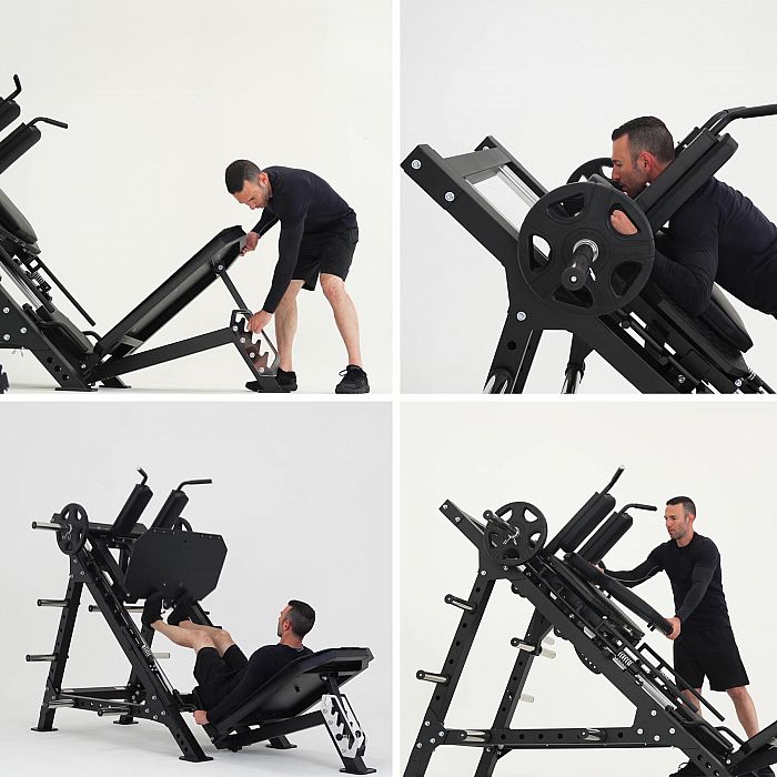 Pro použití stroje jako Leg-press je potřeba umístit zádovou opěru na spodní desku a horní desku zvednout do kolmé polohy. Pro zvednutí desky stačí zatáhnout za pružinový kolík ukrytý v rámu, zvednout desku a nastavit ji tak, aby pružinový kolík zapadl do otvoru v robustní vzpěře.