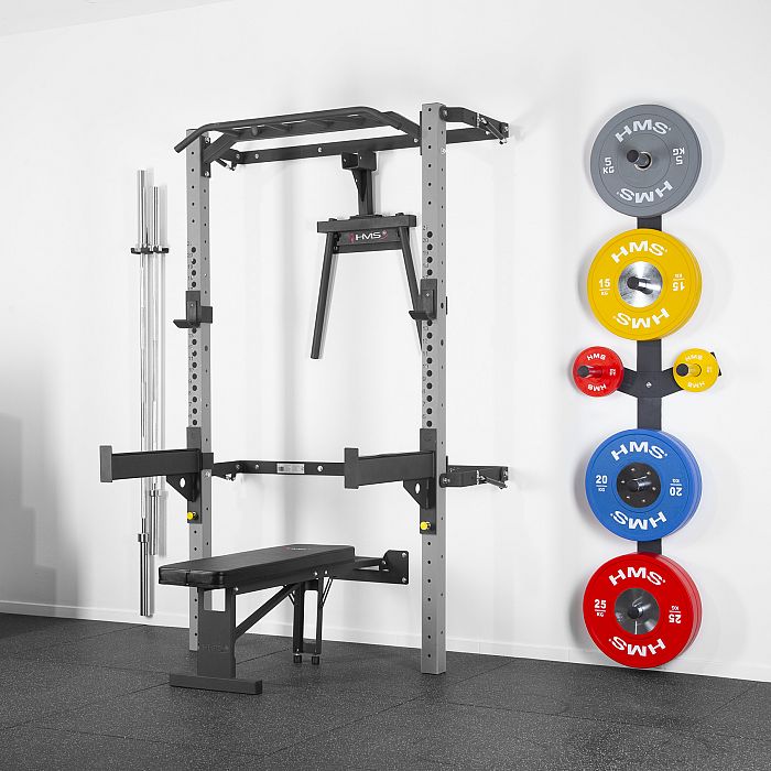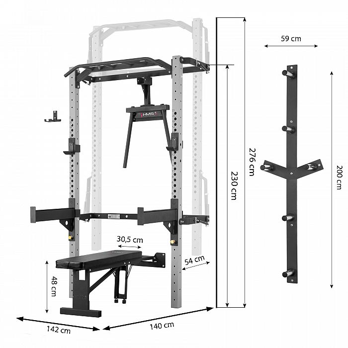 Skládací posilovací stojan - Power Rack KLT22 od společnosti HMS byl navržen tak, aby odpovídal současným trendům na trhu a splňoval očekávání nejnáročnějších zákazníků. Rack v této variantě se prodává s dalším vybavením. Kromě hrazdy, háků na činky a bezpečnostních podpěr zde najdete skládací rovnou lavici, adaptér na dipy, nástěnný stojan na činky a držák na osy. Taková sada rozšíří vaše tréninkové možnosti a poskytne vám nové úložné prostory pro vaše vybavení.