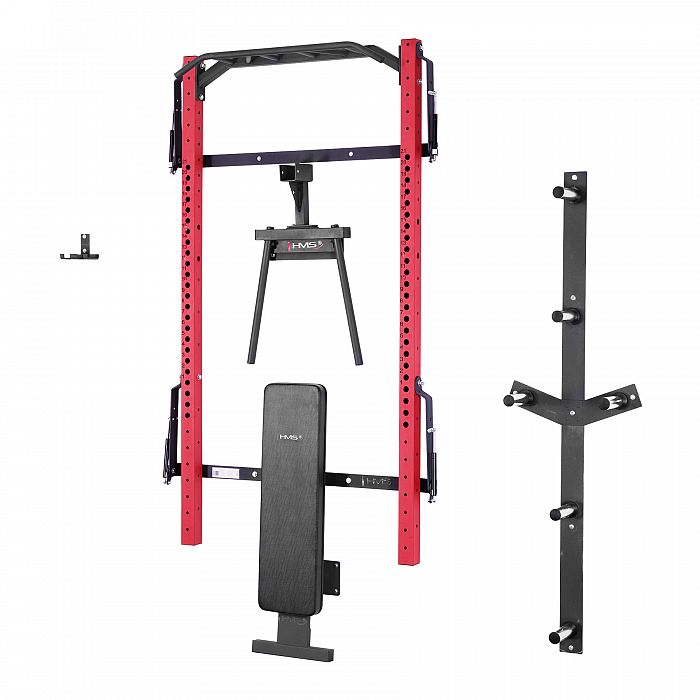 Skládací posilovací stojan - Power Rack KLT22 od společnosti HMS byla navržen tak, aby odpovídal současným trendům na trhu a splňoval očekávání nejnáročnějších zákazníků. Rack v této variantě se prodává s dalším vybavením. Kromě hrazdy, háků na činky a bezpečnostních podpěr zde najdete skládací rovnou lavici, adaptér na dipy, nástěnný stojan na činky a držák na osy. Taková sada rozšíří vaše tréninkové možnosti a poskytne vám nové úložné prostory pro vaše vybavení.