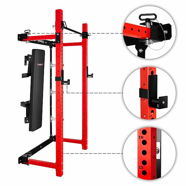 Popis: Multifunkční skládací posilovací stojan - Power Rack HMS KLT34 červený