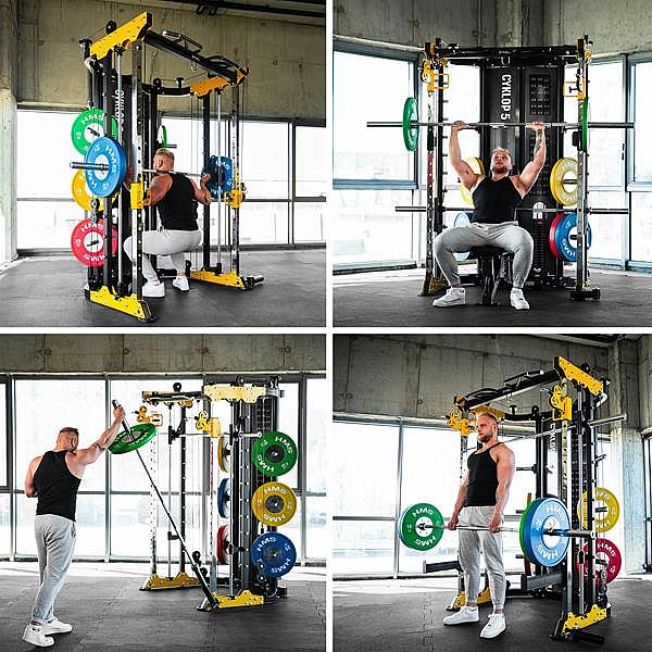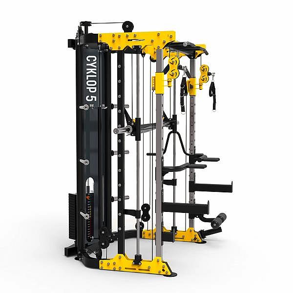 Cyklop 5 je pokročilý tréninkový stroj, který kombinuje funkčnost multipressu s bezpečností a pohodlím při používání. Díky dvěma nezávislým 90 kg sadám závaží, četným adaptérům a příslušenství nabízí Cyklop 5 komplexní trénink celého těla – od svalů horní poloviny těla až po nohy.