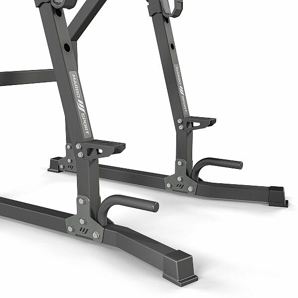 Konstrukce MS-U110 2.0 je vybavena háky, které vám umožní pohodlně odložit činku do optimální výšky pro právě prováděný cvik a zároveň získat lepší výchozí pozici pro další sérii. Háky lze nastavit do 9ti úrovní v rozsahu od 51 do 141 cm od země. Ať už trénujete benchpress, dřepy s činkou nebo mrtvé tahy, budete moci činku po každém cviku pohodlně odložit.