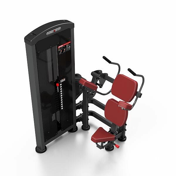 Stroj na posílení břišních svalů MARBO MP-U223 je nekompromisní, profesionální vybavení pro Vaší posilovnu. Pro výrobu byly zvoleny ocelové profily 120x60x3mm a 80x40x3mm, které zaručují nečekanou trvanlivost. Zátěž tvoří 12ks 10kg cihel. Celková váha závaží dodávána se strojem je tedy 120kg a je možné ji rozšířit až na 160kg. Regulace výšky sedadla je nastavitelná ve čtyřech úrovních za použití červeného, pneumatického jistícího kolíku. Napínaní lanek se provádí regulací 4 šroubů na hlavním vodícím kole. Odpadá tak složité rozebírání stroje. Polstrovaní je ze syntetické kůže sešité režnou nití značky COATS vyplněné tvrdou pěnou, to celé ja na 3mm hrubé, ocelové desce. Tichý chod zajištuje zakrytování černým plastem, z přední části je kryt opatřen průhledem pro snadné nastavení požadovaného počtu cihel. Stroj je navíc opatřen velikou samolepkou, která instruuje cvičence, jaké cviky jdou na stroji provádět a které skupiny svalů daný cvik posiluje.