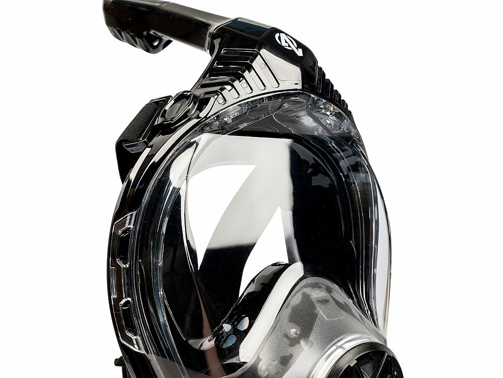 Pod vodou – kulička stoupá v důsledku vztlaku, vzduchový ventil se uzavře a voda se nedostane do masky - 180° panoramatický pohled. Pohlcující podvodní výhled