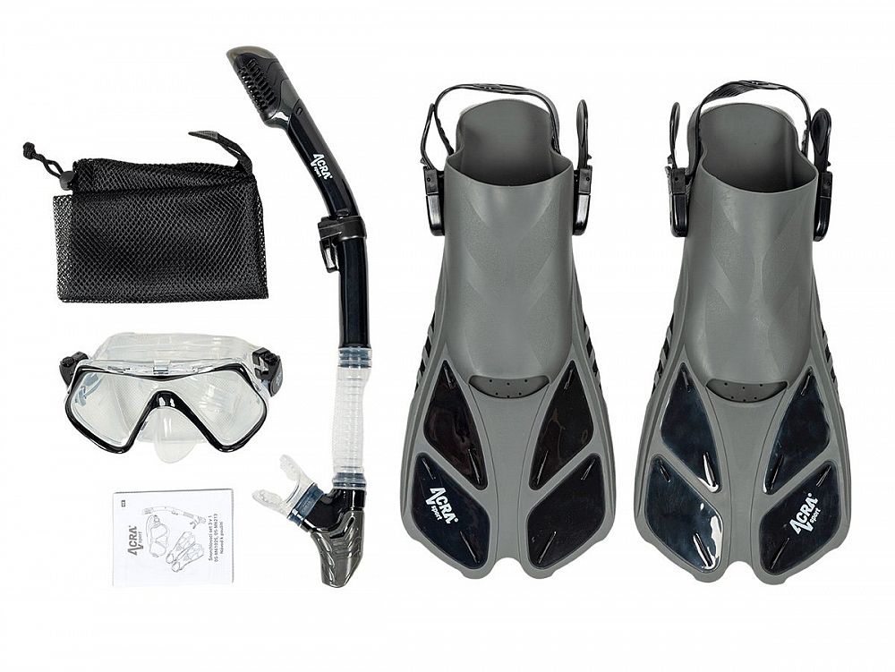 Sada šnorchlu Acra Sport s nastavitelnými ploutvemi, maska z tvrzeného skla se dvěma průhledy, silikonový šnorchl Dry Top a cestovní taška na vybavení. Šnorchlovací set Acra je dokonalý společník na cesty a je vhodný pro šnorchlování, plavání, potápění a mnoho dalšího.