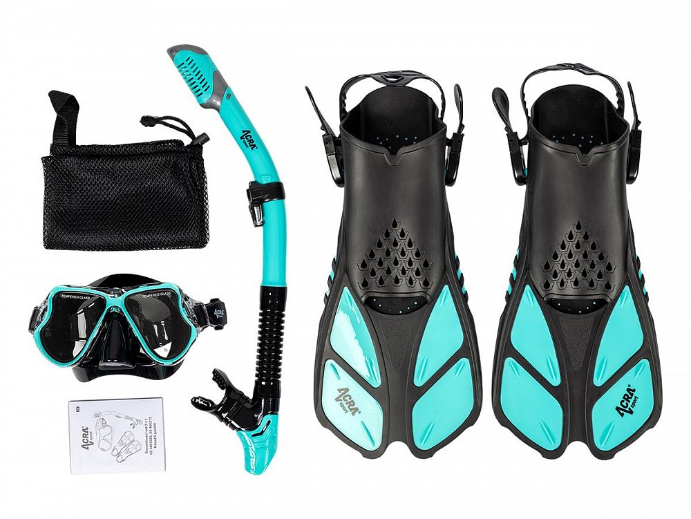 Sada šnorchlu Acra Sport s nastavitelnými ploutvemi, maska z tvrzeného skla se dvěma průhledy, silikonový šnorchl Dry Top a cestovní taška na vybavení. Šnorchlovací set Acra je dokonalý společník na cesty a je vhodný pro šnorchlování, plavání, potápění a mnoho dalšího.