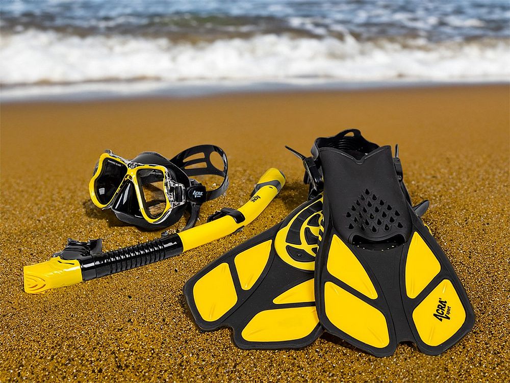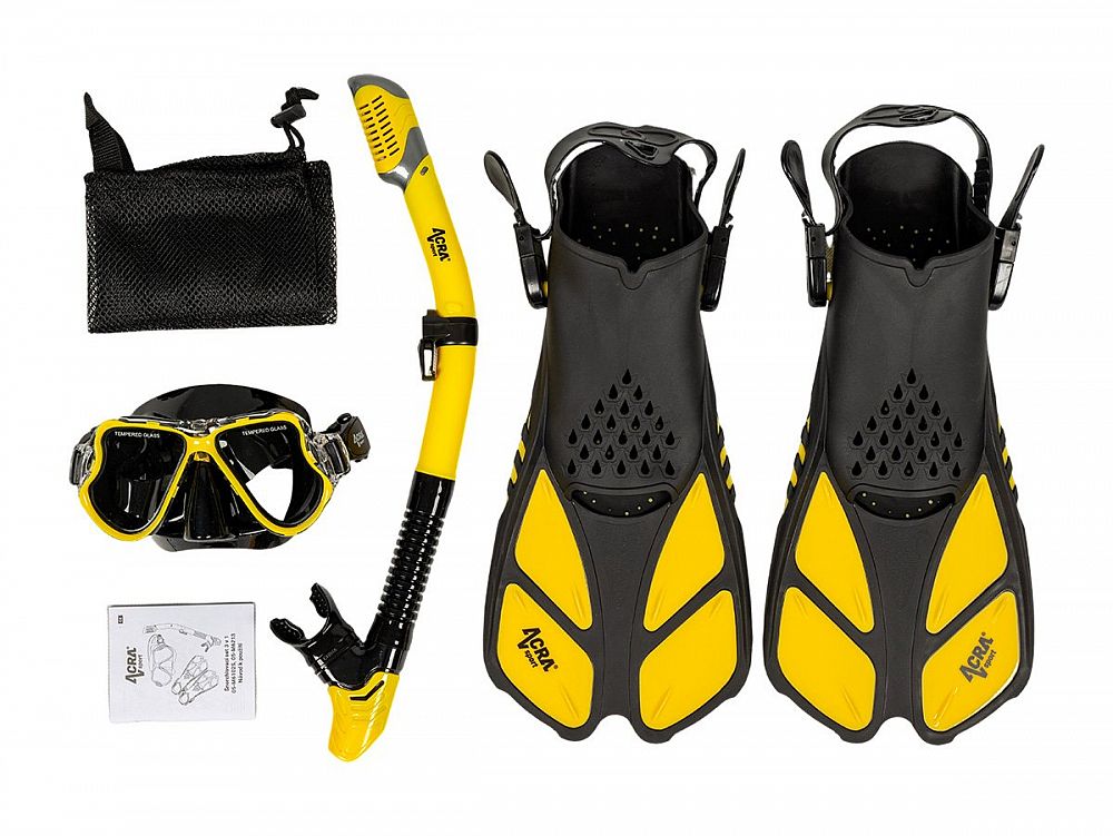 Sada šnorchlu Acra Sport s nastavitelnými ploutvemi, maska z tvrzeného skla se dvěma průhledy, silikonový šnorchl Dry Top a cestovní taška na vybavení. Šnorchlovací set Acra je dokonalý společník na cesty a je vhodný pro šnorchlování, plavání, potápění a mnoho dalšího.