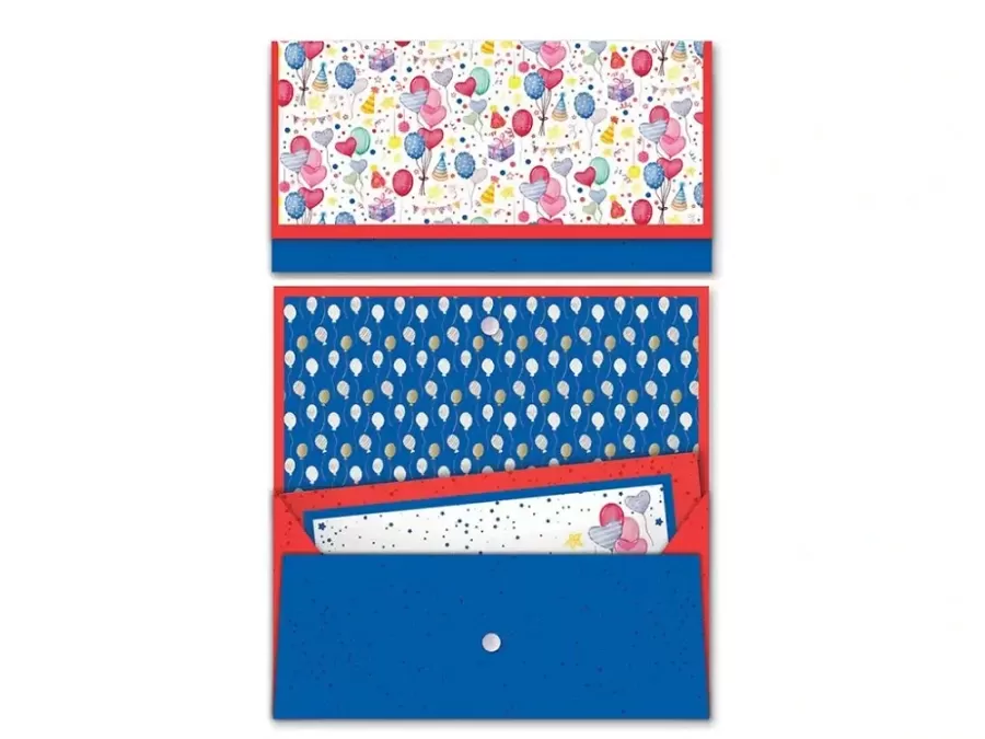 Dárková obálka na peníze či poukazy s motivem barevných veselých balónků. Efektivní zapínání obálky na suchý zip. Navíc uvnitř najdete kartičku na libovolné přáníčko s věnováním. Aby to bylo jako překvapení, je v balení papírová obálka na schování.