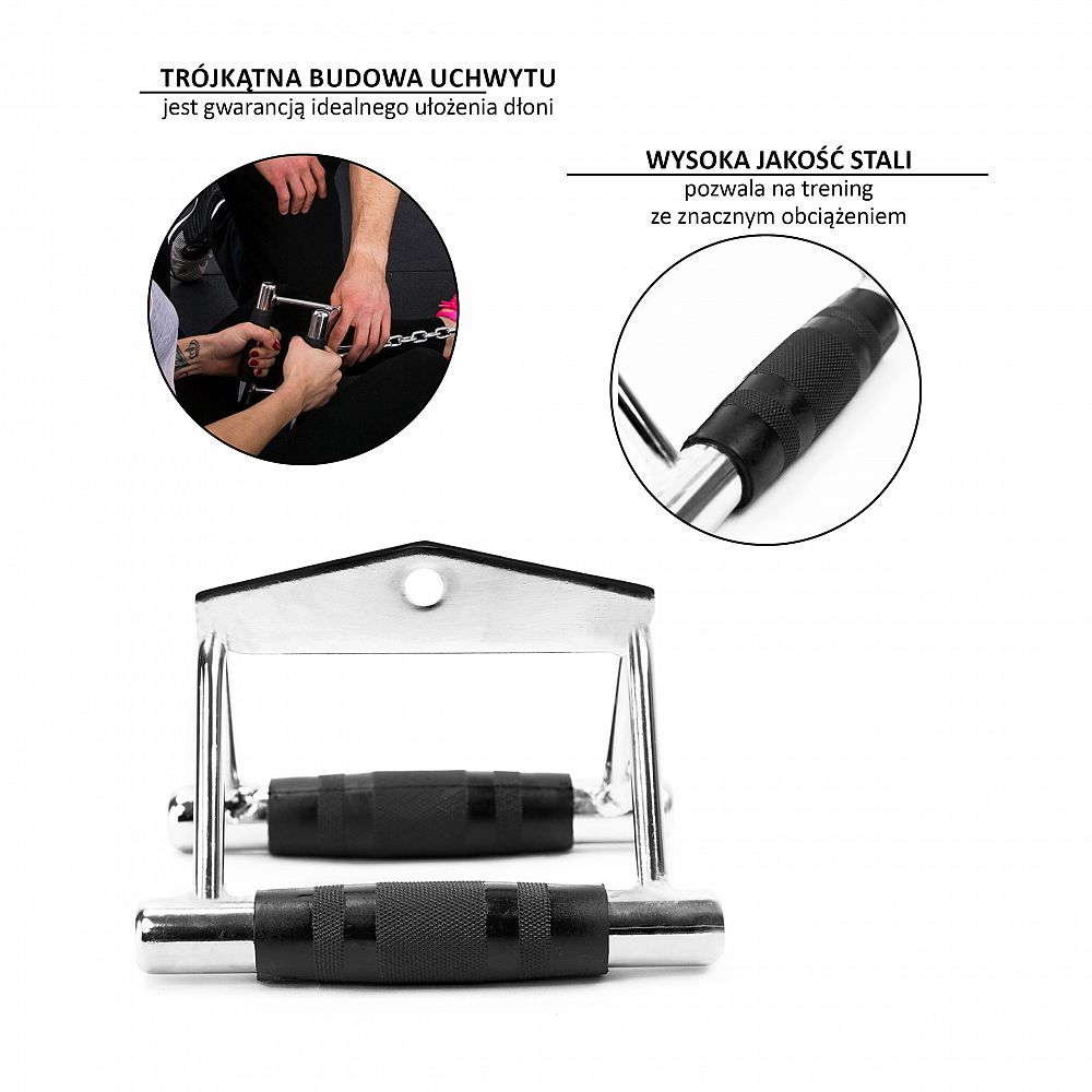 Trojúhelníková konstrukce úchopu zaručuje dokonalou polohu ruky a zároveň nutí ke správnému pohybu při cvičení. Pogumovaná rukojeť zajišťuje bezpečné držení a zabraňuje vyklouznutí adaptéru z ruky a zároveň vyžaduje pevnější úchop. Tímto způsobem také pracujeme na rozvoji svalů předloktí. Nepříliš široká rozteč rukojeti, usnadňuje udržení správné dráhy pohybu, tj. vedení loktů v blízkosti trupu. Adaptér UW04 je vyroben z kvalitní chromované oceli, která umožňuje trénink se značnou zátěží.