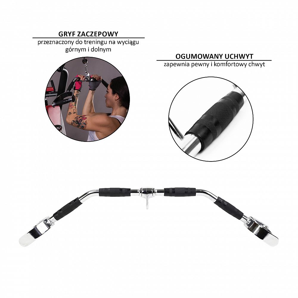 UW15 je vyroben z vysoce kvalitní oceli, což vám dává možnost cvičit se značnou zátěží. Jeho délka a rozteč pogumovaných rukojetí zaručují širokou škálu možností úchopu - od velmi úzkého až po velmi široký. Adaptér tak umožní komplexní procvičení svalů. Rukojeti jsou v nejširších místech pod úhlem, což napomáhá přitahování loktů k trupu, a tím udržení lepší techniky cvičení. Během cvičení umožňuje UW15 zapojit alternativní svalové úpony ve srovnání s cviky s rovným adaptérem. Madla opatřené gumou zajišťují bezpečný a pohodlný úchop bez obav, že vám adaptér vyklouzne z rukou.