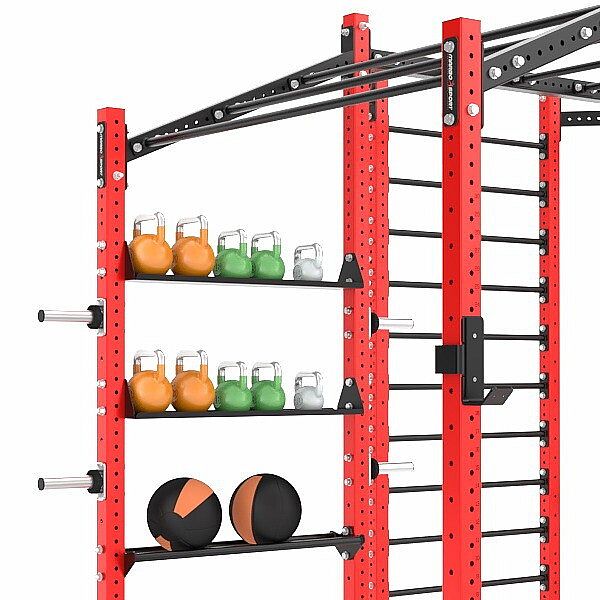 Police se připevní ke stojnám pomocí 4 ks dodávaných šroubů. Po dotažení je police ideální pro odkládání příslušenství (kettlebelly, švihadla,...).