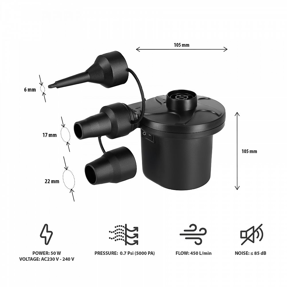 Zařízení dosahuje průtoku vzduchu 450 litrů za minutu, což umožňuje bleskurychlé nafouknutí i větších nafukovacích doplňků. Pracovní tlak až 5kPa zajišťuje správnou tvrdost nafukovaných předmětů a maximální hlučnost nepřesahuje 85 dB, což činí pumpu pohodlnou pro každodenní použití. Pumpu lze použít také k vyfukování.
