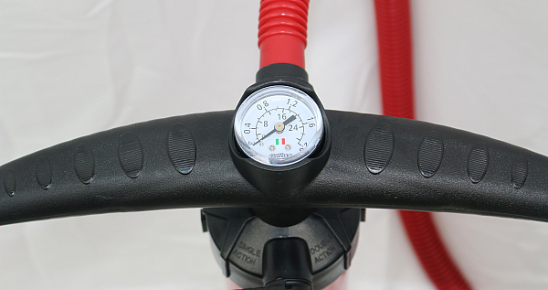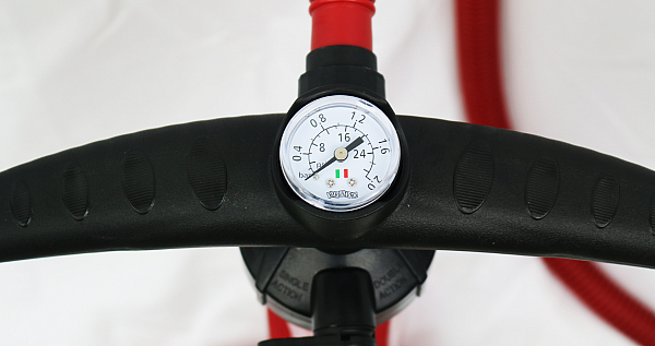Vlnitá hadice dodávaná s pumpou Bravo je zakončena bajonetovým konektorem speciálně pro vysokotlaké ventily, které se často vyskytují u nafukovacích SUPů nebo kajaků. Na rukojeti je naopak integrován praktický tlakoměr, takže tlak nafukování je vždy jasný a nehrozí, že byste své vybavení nafoukli na nesprávný tlak.