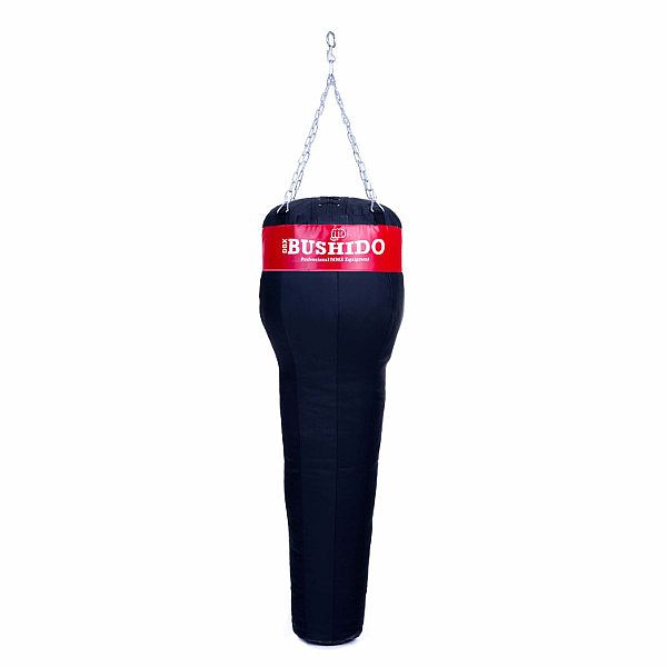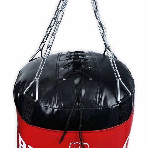 Profesionální boxovací hákový pytel DBX BUSHIDO 140 x 45 až 30 cm. Délka řetezů při zavěšení 45 cm (díky karabině lze nastavit i kratší délku).