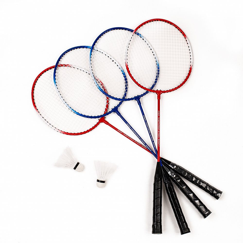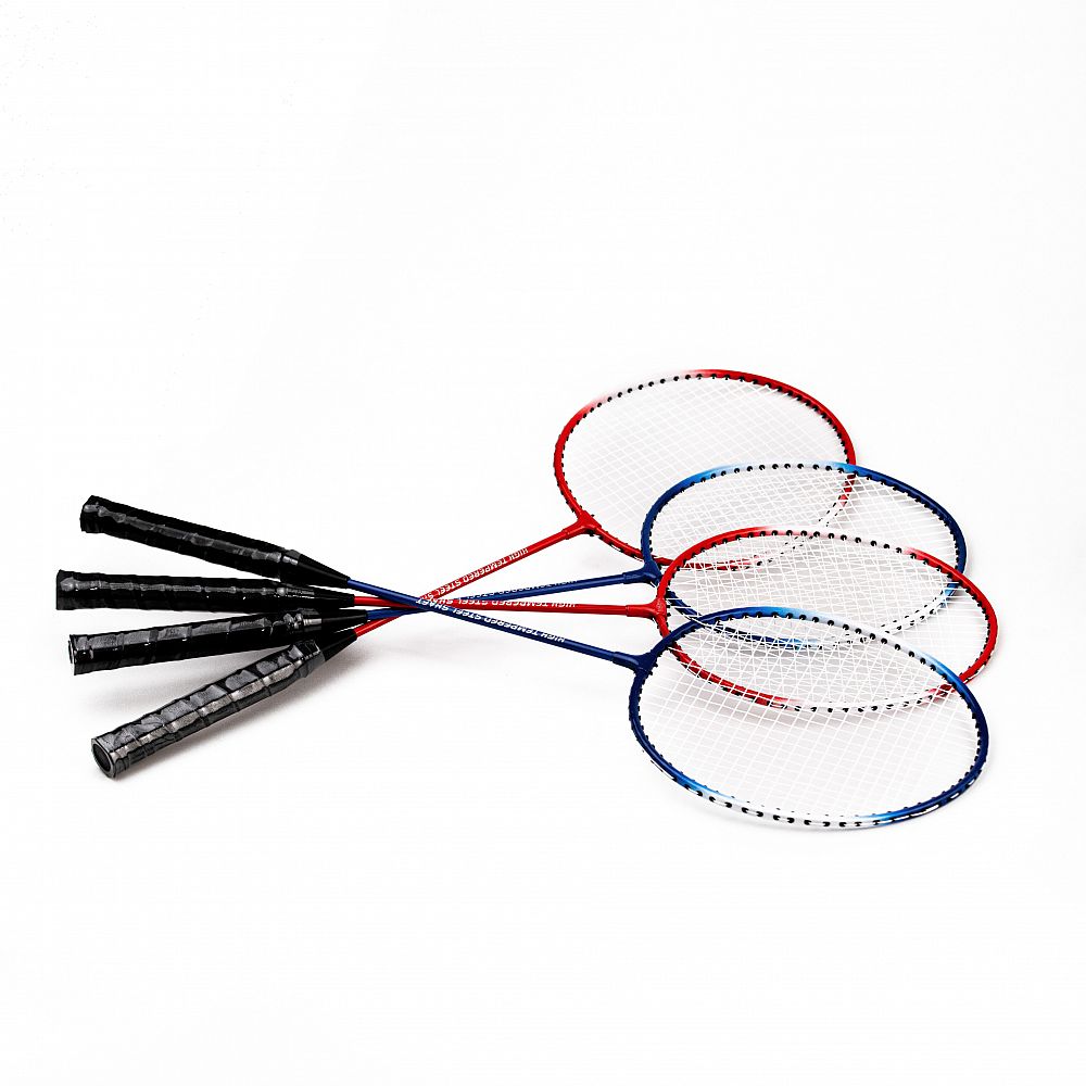 Čtyři rakety: Set obsahuje celkem 4 rakety s odolným iron rámem, které zajišťují dobrou odolnost a stabilitu během hry. Součástí jsou 2 rakety v modré barvě a 2 rakety v červené barvě pro snadné rozlišení mezi hráči.