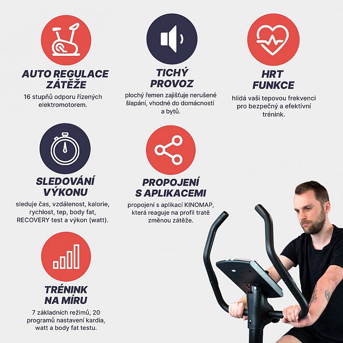 - Možnost použití aplikací napojených přes tablet nebo mobilní telefon. Doporučujeme použití aplikací KINOMAP, které nabízejí širokou škálu použití s možností placených rozšířených funkcí podle vlastního přání.