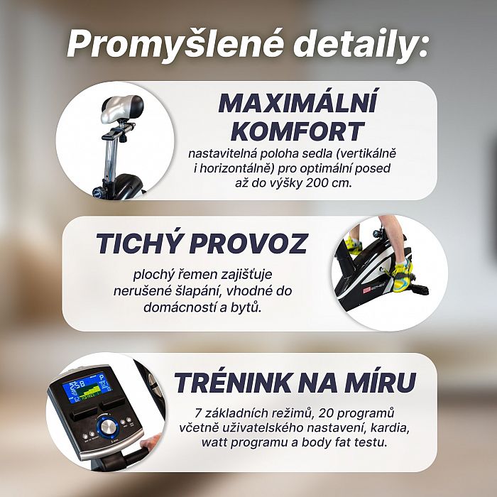 - převod plochým řemenem - tichý chod stroje, který lze využívat bez omezení v obytném prostoru. Tichý chod nezpůsobuje hluk, kterým by bylo rušeno okolí.