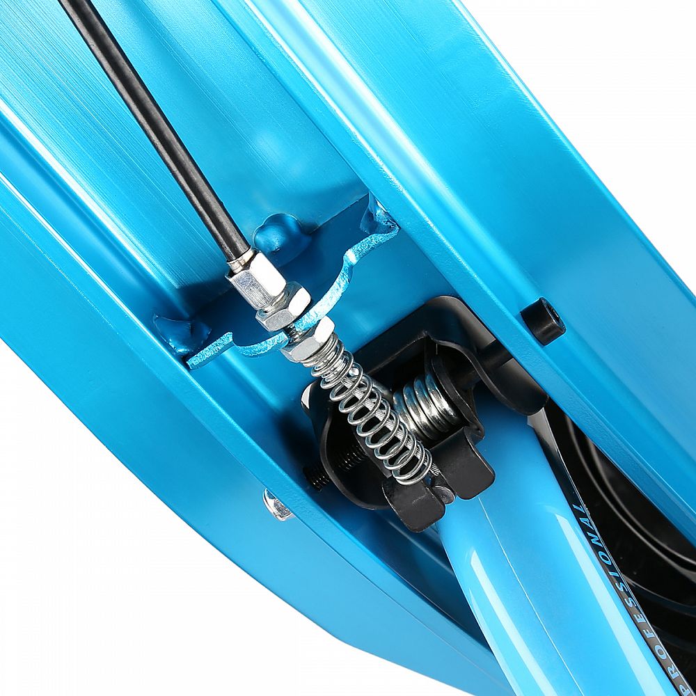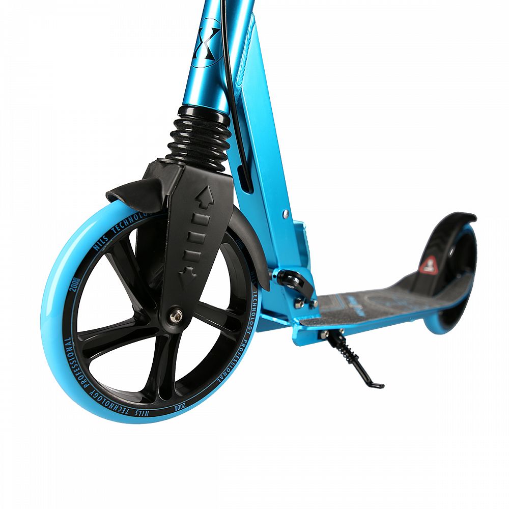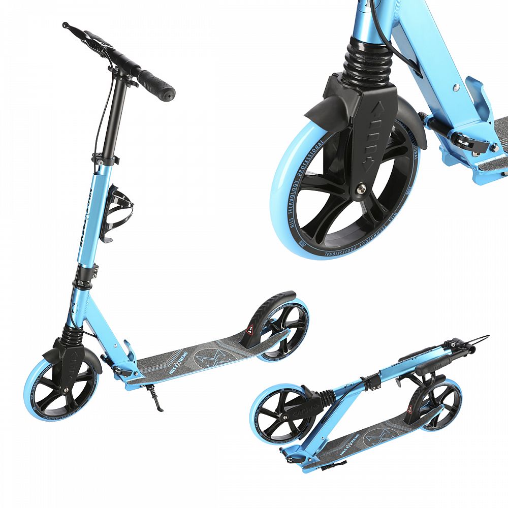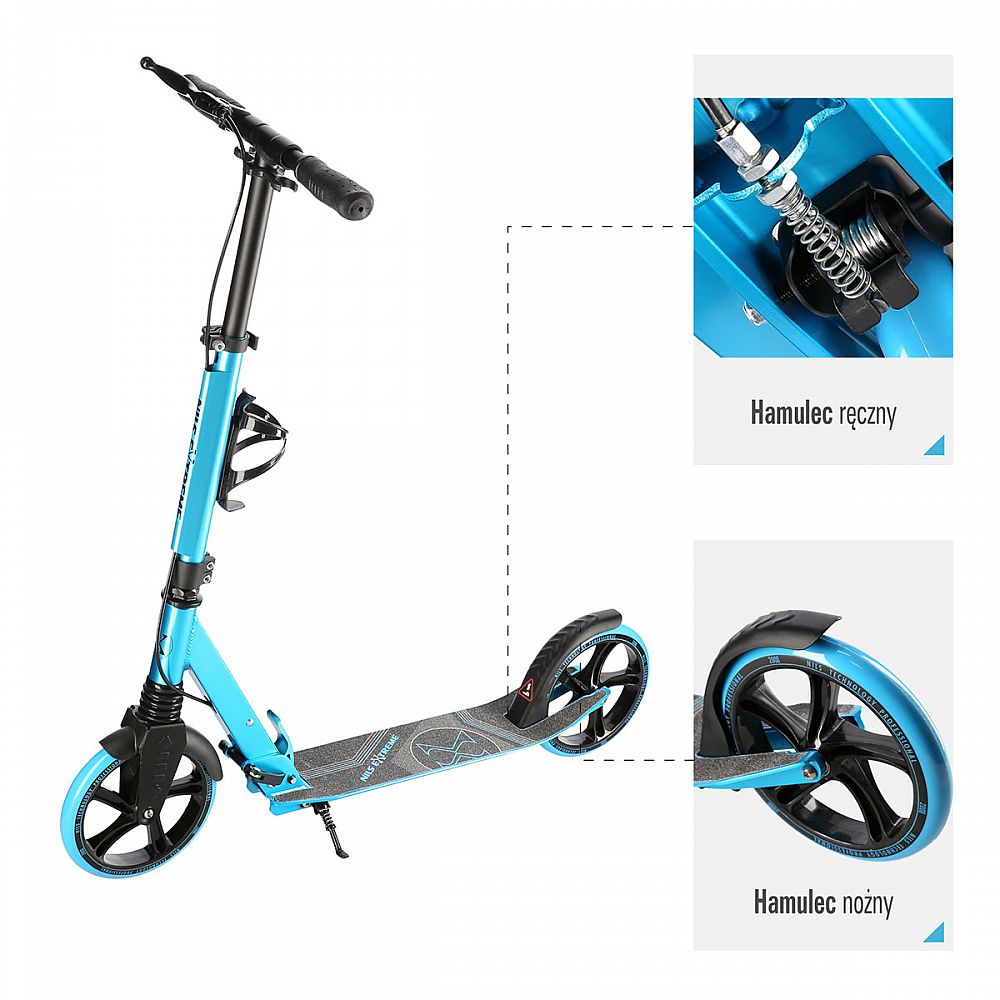 Systém odpružení předního kola zvyšuje jízdní komfort. Tlumič pohlcuje nárazy a jízda po nerovném asfaltu, nebo dlažebních kostkách je příjemnější a tižší. Zadní blatník slouží jako přítlačná brzda, která ještě podtrhuje brzdný účinek mechanické brzdy ovládané lankem z páčky na řídítkách, ty jsou opatřeny gumovými rukojeťmi, které zajišťují pevný a pohodlný úchop. Velká kola jsou osazena ložisky ABEC 7 a polyuretanovou pneumatikou o průměru 200 milimetrů. Tato kombinace zajišťuje rychlou, plynulou a bezpečnou jízdu. Na sloupku řídítek má své místo držák pro odložení láhve s nápojem, který najde své využití při delších vyjížďkách. Blatník na předním kole a skládací stojánek jsou již jen pomyslnou "třešničkou na dortu", která přizpívá k maximálnímu možnému komfortu z jízdy a k celkové radosti ze samotného použivání modelu MH2140.