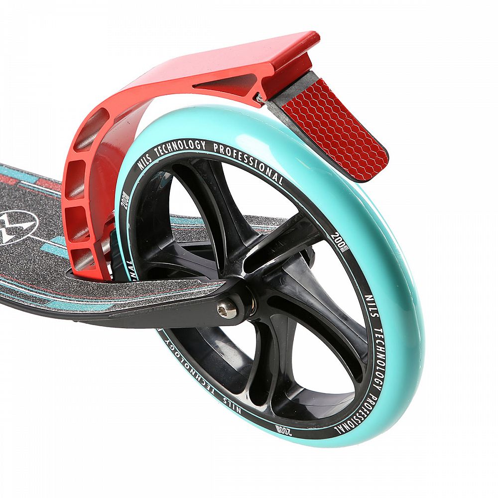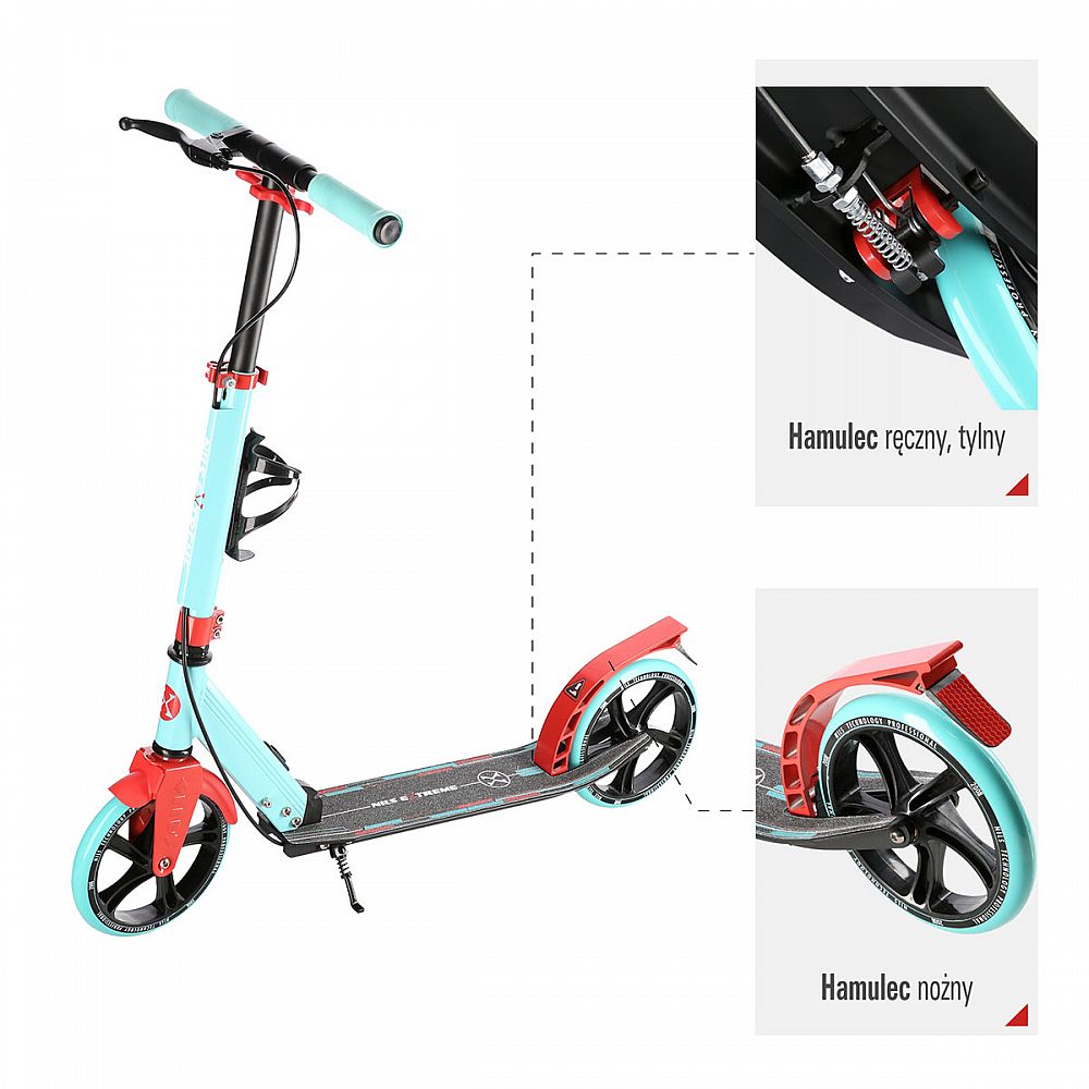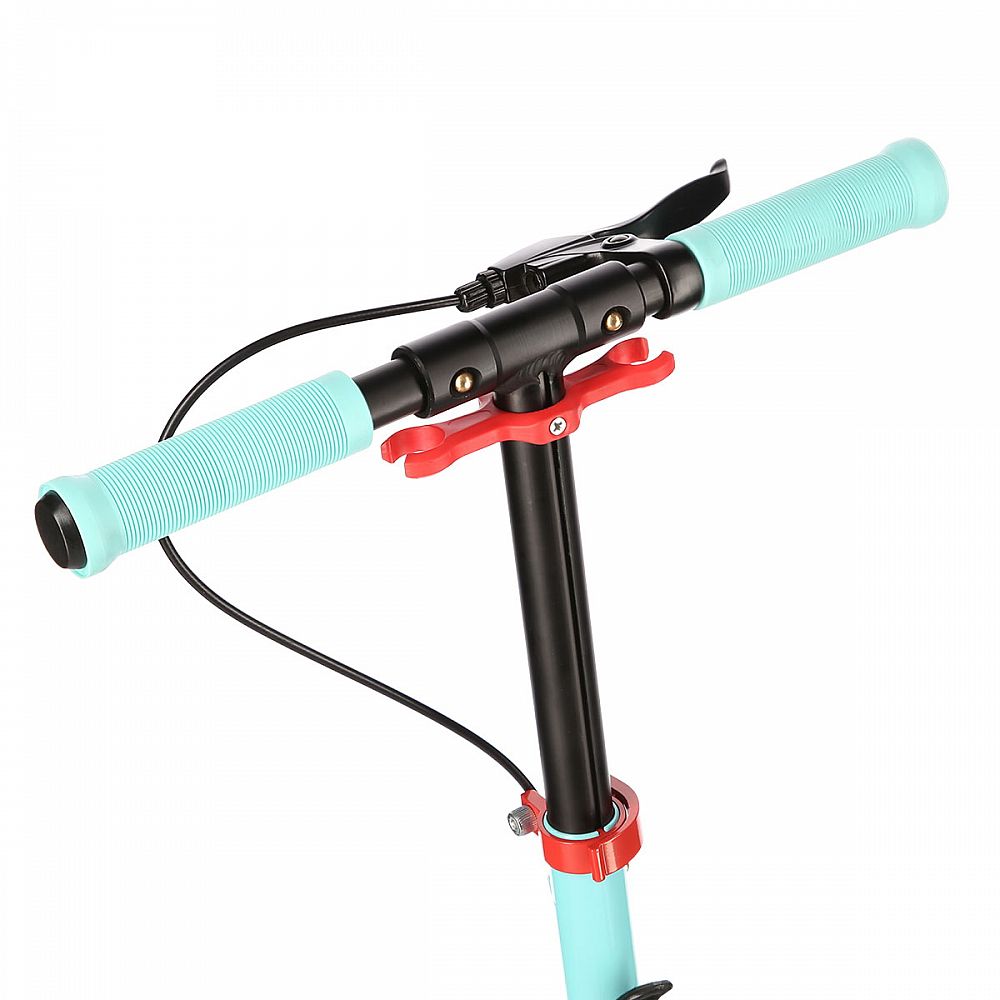 Zadní blatník slouží jako přítlačná brzda, která ještě podtrhuje brzdný účinek mechanické brzdy ovládané lankem z páčky na řídítkách, ty jsou opatřeny gumovými rukojeťmi, které zajišťují pevný a pohodlný úchop. Velká kola jsou osazena ložisky ABEC 7 a polyuretanovou pneumatikou o průměru 200 milimetrů. Tato kombinace zajišťuje rychlou, plynulou a bezpečnou jízdu. Na sloupku řídítek má své místo držák pro odložení láhve s nápojem, který najde své využití při delších vyjížďkách. Blatník na předním kole využijete, pokud Vás zastihne dešťová přeháňka.