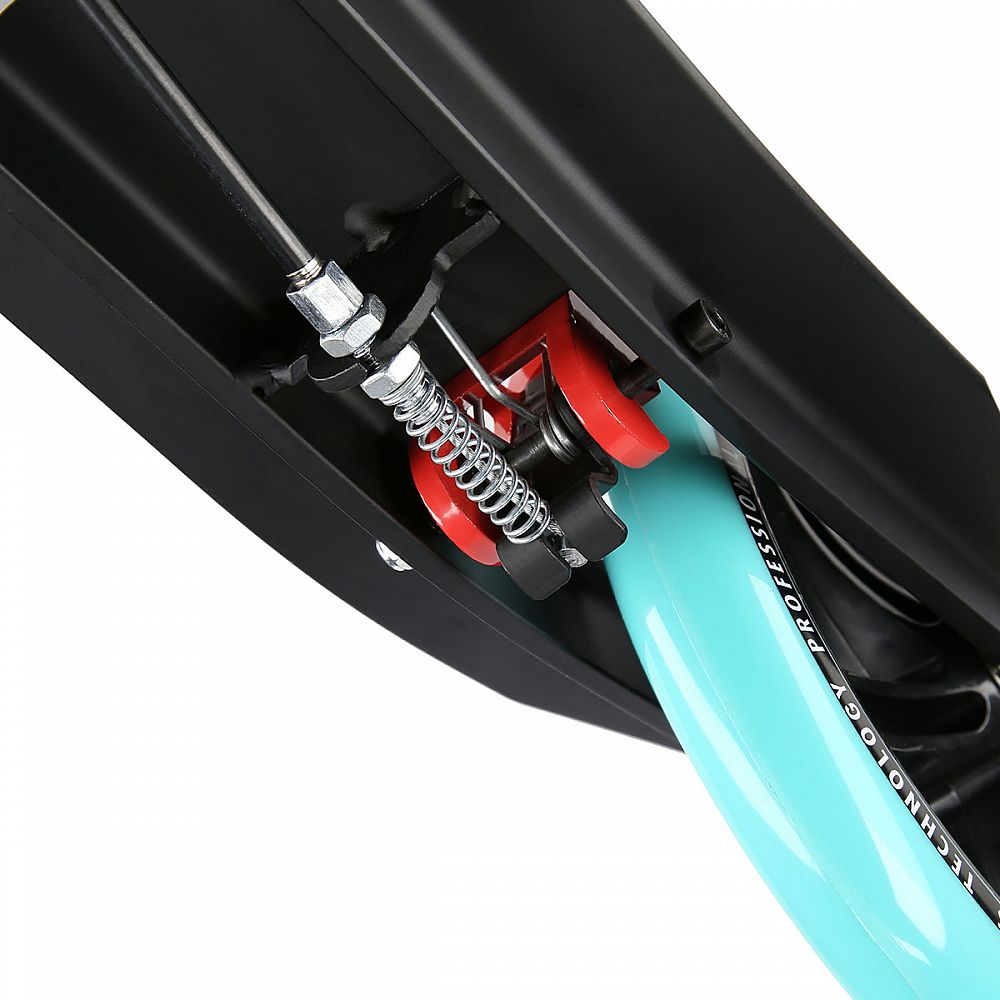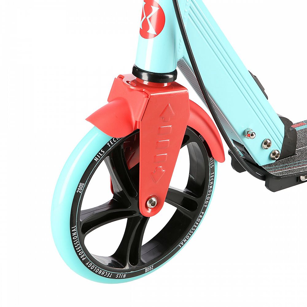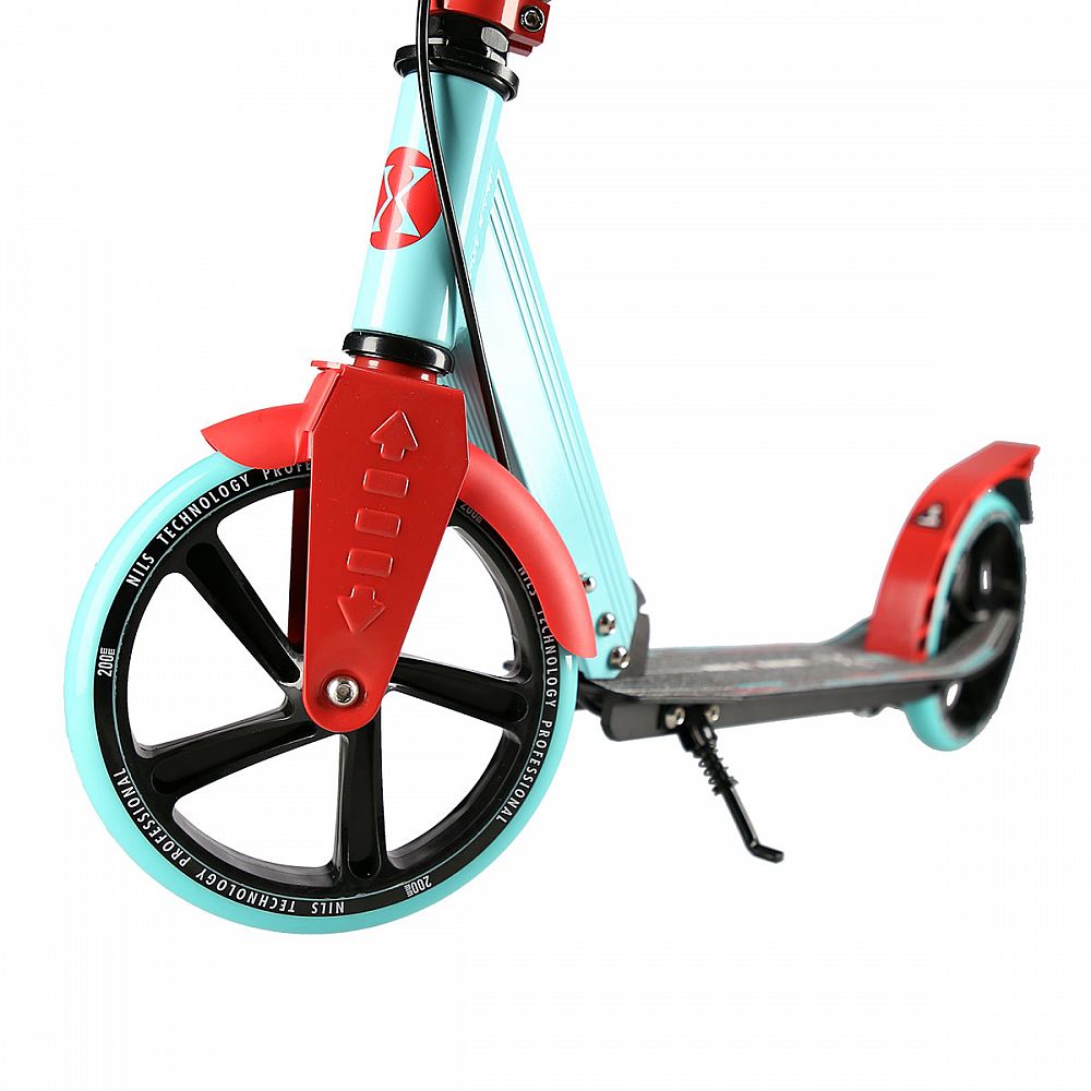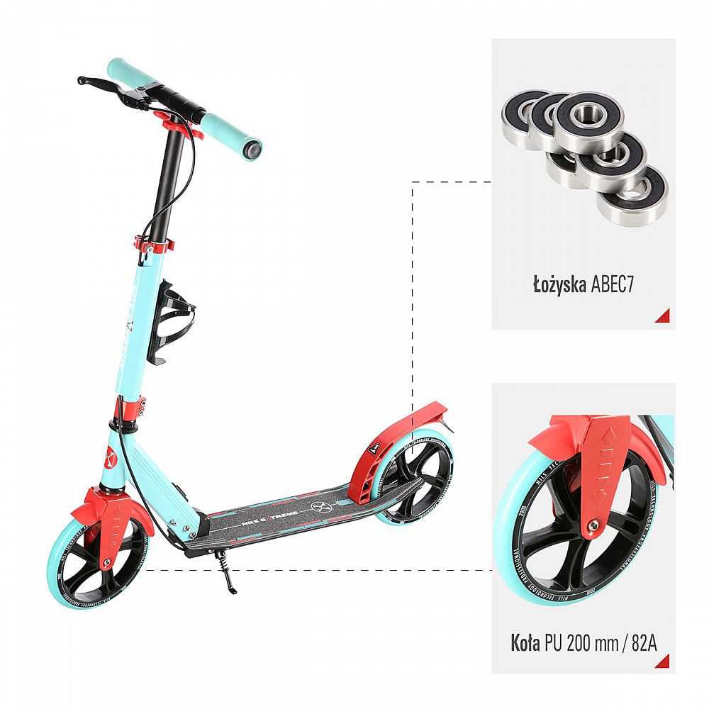 Zadní blatník slouží jako přítlačná brzda, která ještě podtrhuje brzdný účinek mechanické brzdy ovládané lankem z páčky na řídítkách, ty jsou opatřeny gumovými rukojeťmi, které zajišťují pevný a pohodlný úchop. Velká kola jsou osazena ložisky ABEC 7 a polyuretanovou pneumatikou o průměru 200 milimetrů. Tato kombinace zajišťuje rychlou, plynulou a bezpečnou jízdu. Na sloupku řídítek má své místo držák pro odložení láhve s nápojem, který najde své využití při delších vyjížďkách. Blatník na předním kole využijete, pokud Vás zastihne dešťová přeháňka.