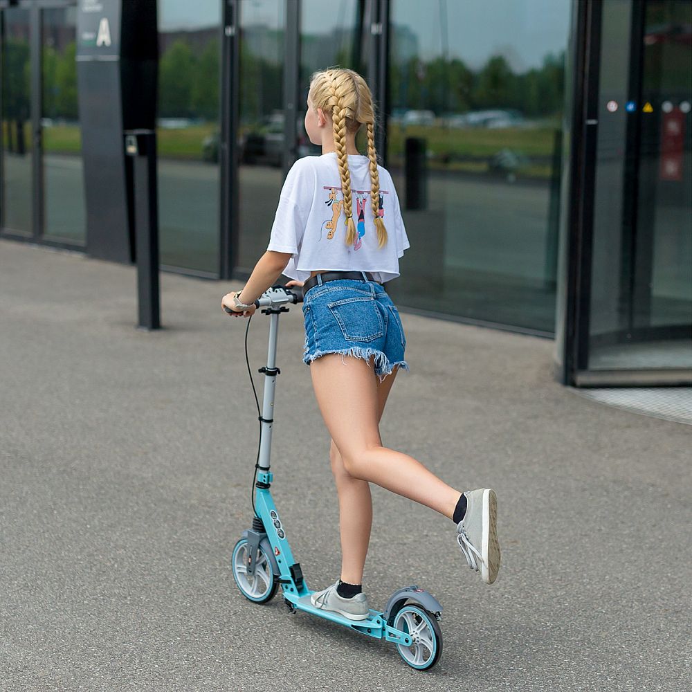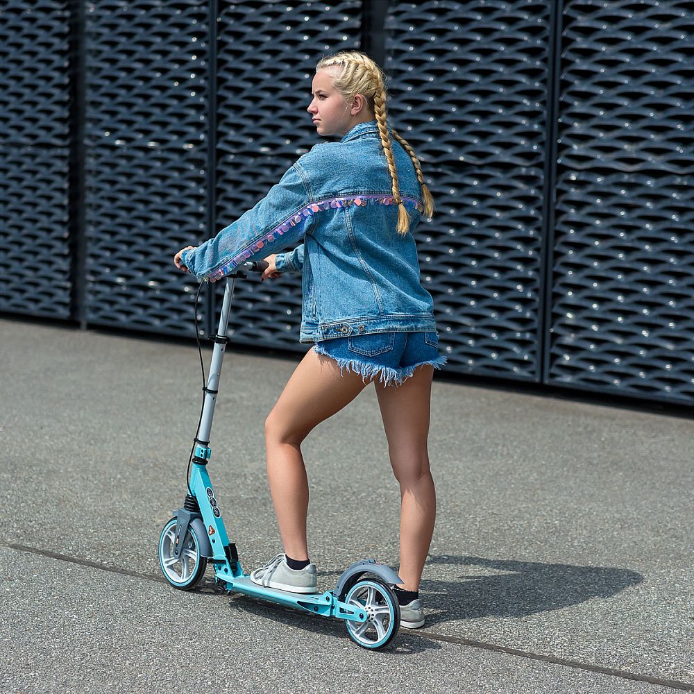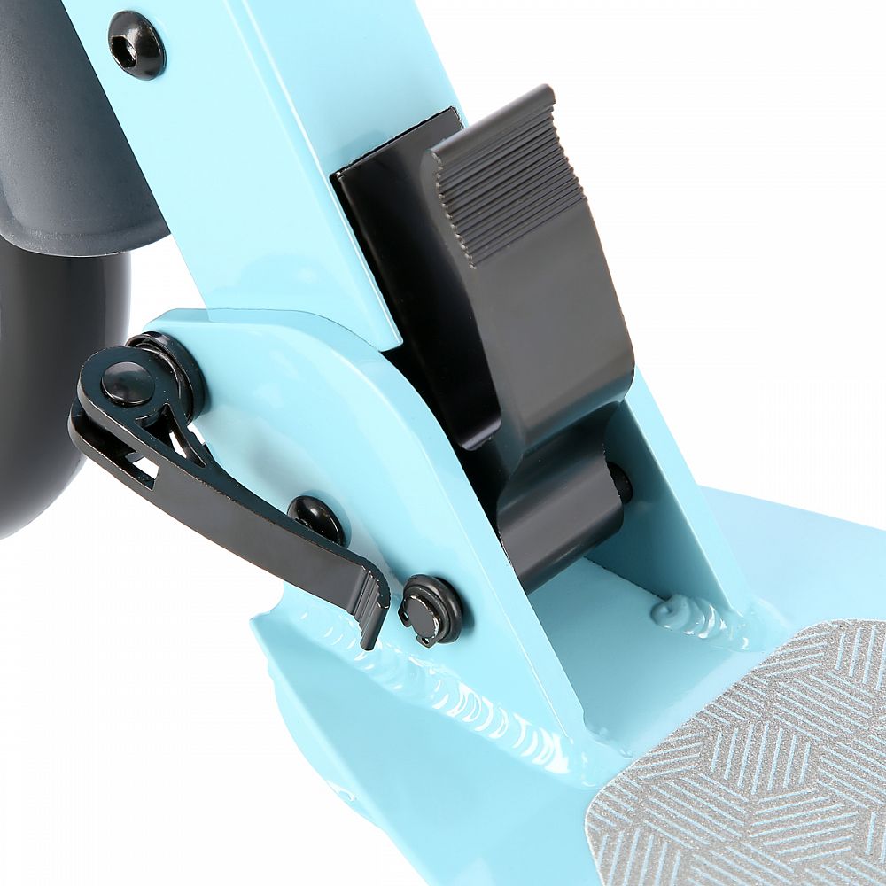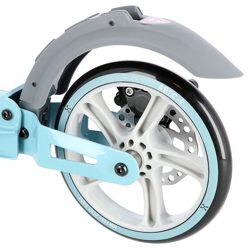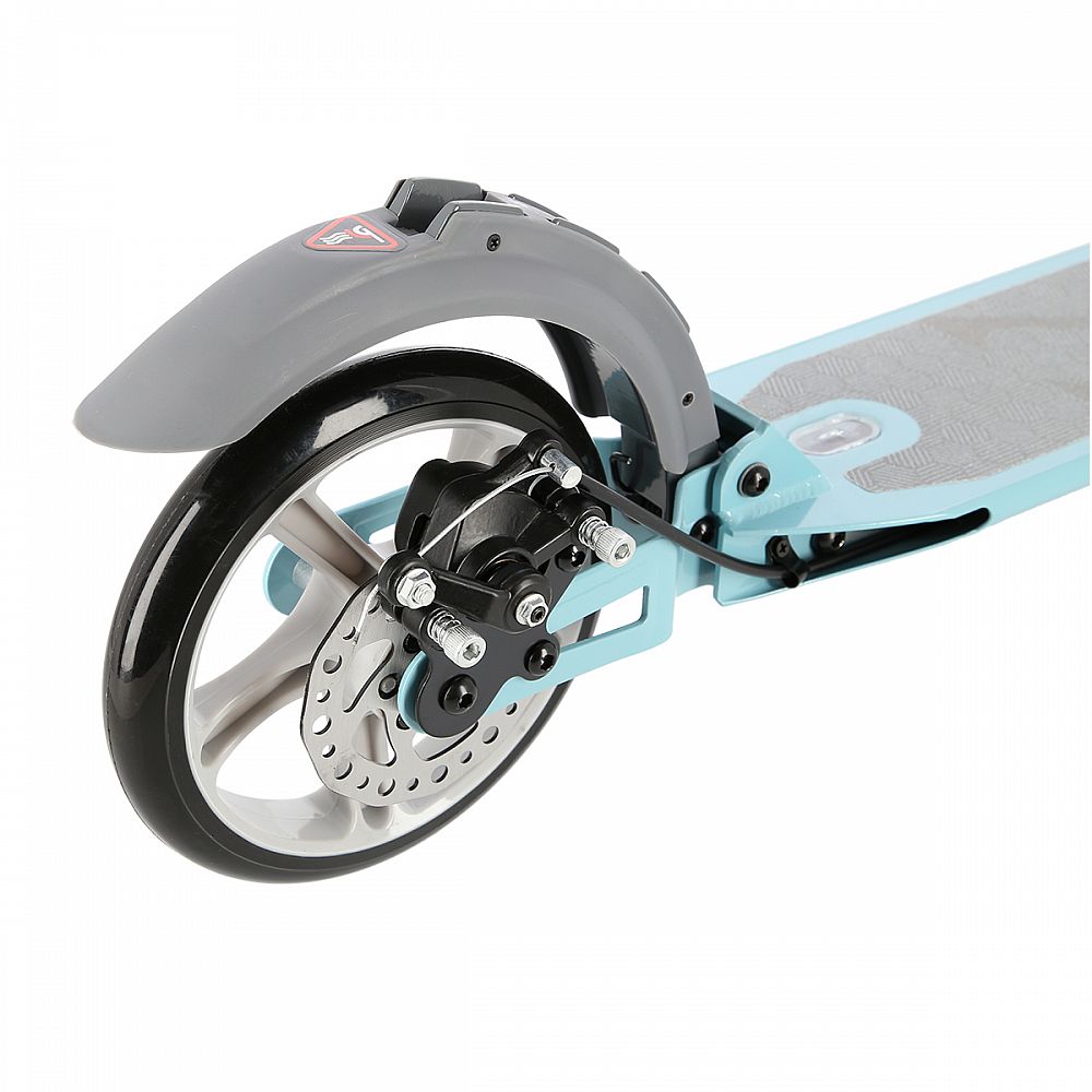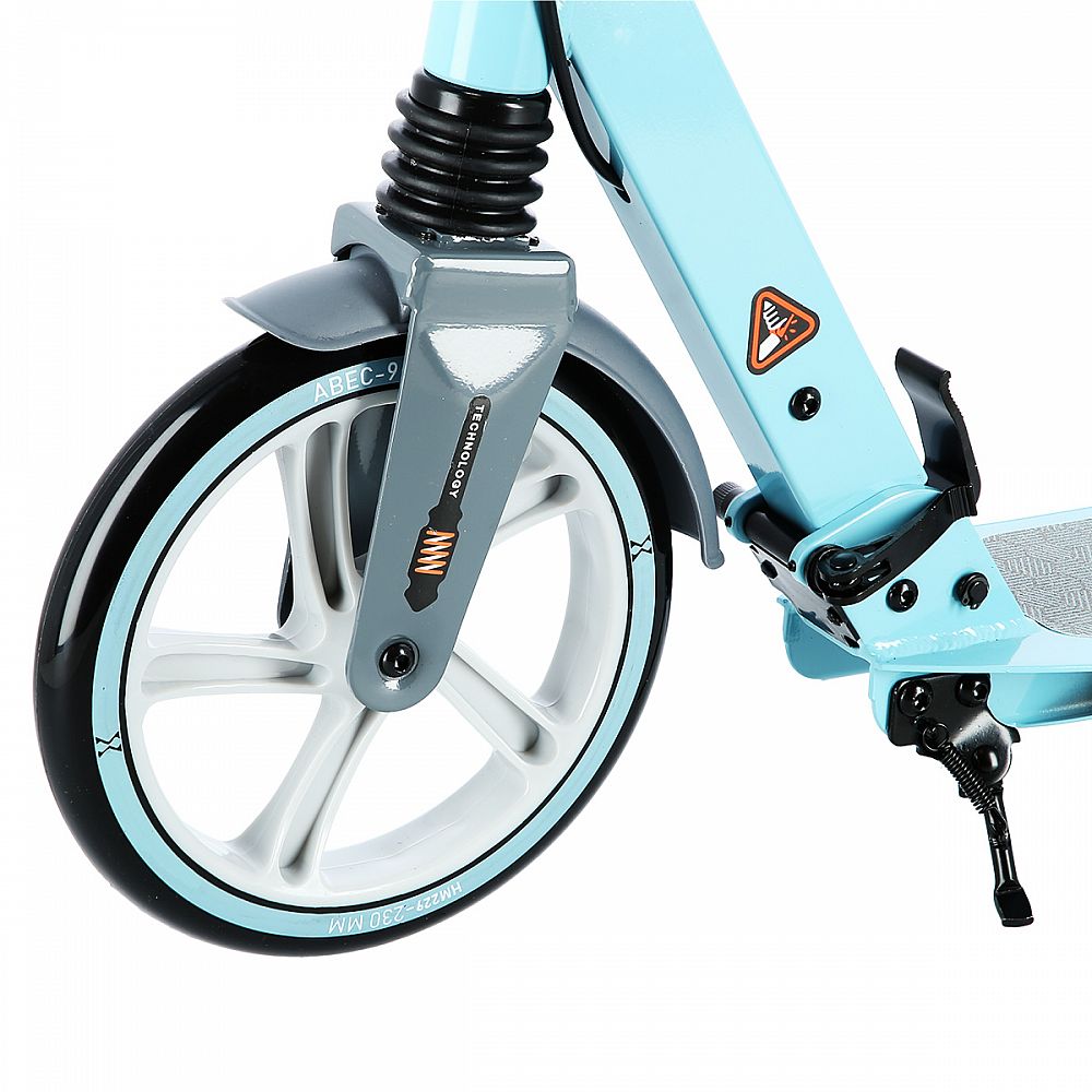 Systém odpružení zvyšuje jízdní komfort. Tlumiče pohlcují nárazy a jízda po nerovném asfaltu, nebo dlažebních kostkách je příjemnější a tižší. Robustní zadní blatník slouží jako nožní, přítlačná brzda, pod blatníkem se skrývá samostatná, malá brzda, která je ovládána páčkou z řídítek. Řídítka jsou opatřena gumovými rukojeťmi, které zajišťují pevný a pohodlný úchop. Velká kola jsou osazena ložisky ABEC 9. Tato kombinace zajišťuje rychlou, plynulou a bezpečnou jízdu. Blatník na předním kole ochrání před znečištěním při průjezdu přes kaluže.