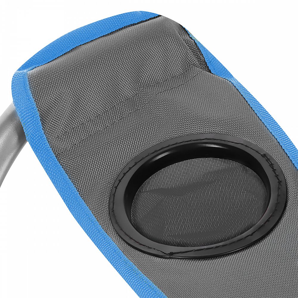 Loketní opěrky mají možnost regulace výšky jednoduchým posunem zadní části po profilu konstrukce.Pravá opěrka lokte je opatřena košíkem, do kterého se pohodlně vejde menší láhev, nebo vysoká sklenice. Pro snadné přenášení lze křeslo složit do dodávaného vaku s popruhem přes rameno.