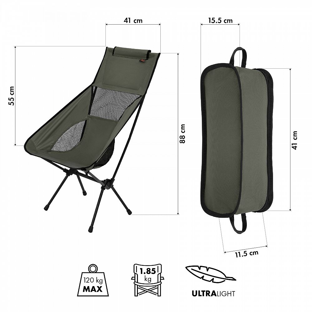 Navzdory robustní konstrukci váží židle pouhých 2,47 kg a ve složeném stavu nabývá kompaktních rozměrů 41 × 15,5 × 11,5 cm, což umožňuje její bezproblémové skladování a přepravu. Dodává se s praktickým pouzdrem, které usnadňuje přenášení a chrání výrobek během cestování.