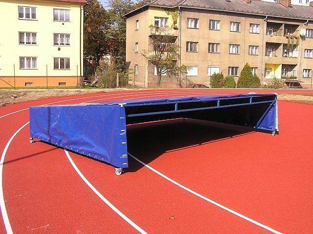 - Ocelová konstrukce pojízdná 300 x 500 cm, výška 80 - 170 cm slouží k zakrytí venkovních žíněnek (dopadových duchen) pro skok vysoký.