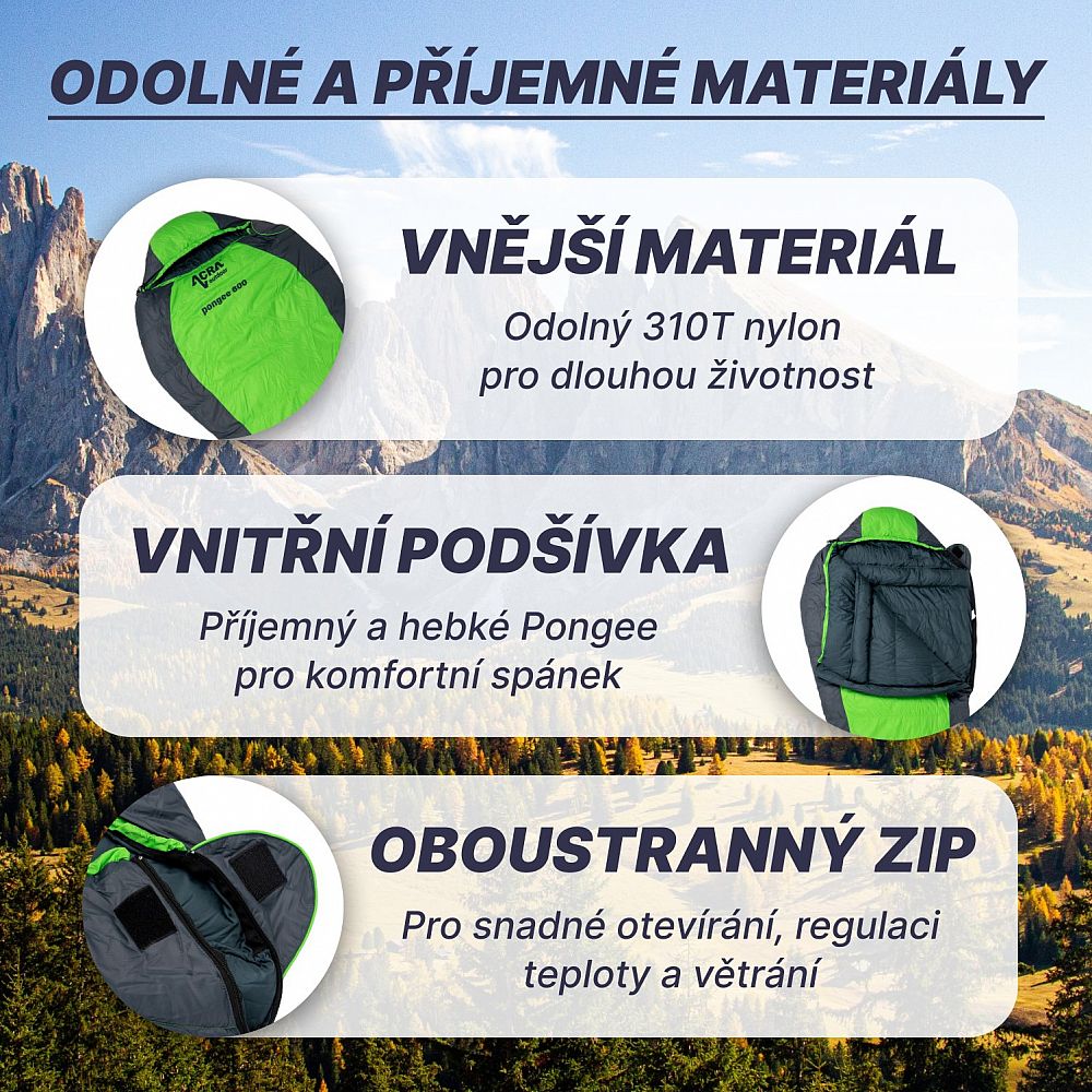 Acra Pongee 800 je skvělý spací pytel pro všechny, kteří si chtějí užít komfortní spánek v přírodě i v těch nejnáročnějších podmínkách. Díky svému mumiovému střihu, kvalitní izolaci z kachního peří a kompaktní velikosti je ideální pro kempování, turistiku a horolezectví.