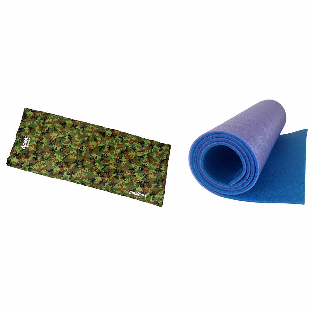 Sada obsahuje letní spacák Acra Masker-T a dvouvrstvou karimatku o tloušťka 8 mm z IFO pěny – odlehčená.