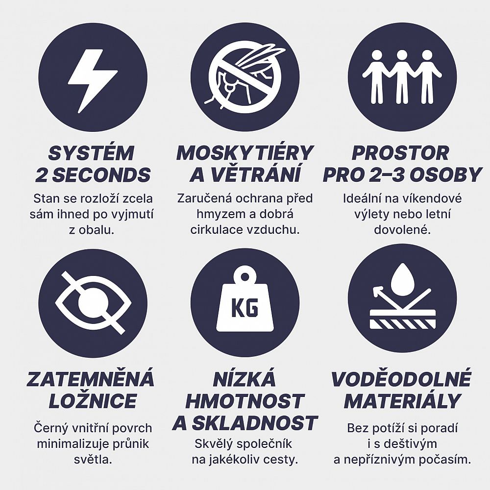 - 2 Seconds systém: Díky navléknutým sklolaminátovým tyčím se stan automaticky postaví po vyndání z obalu. Postavení trvá pouhé 2 minuty, takže si ho můžete užít i v těch nejnáročnějších podmínkách.
