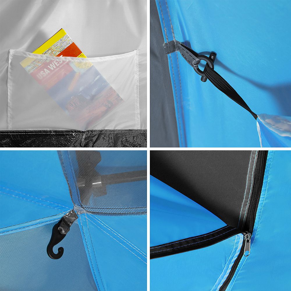 Navíc je stan vybaven čtyřmi vnitřními kapsami, kam schováte své věci, a dvěma úchyty pod stropem, díky kterým můžete zavěsit lampu.