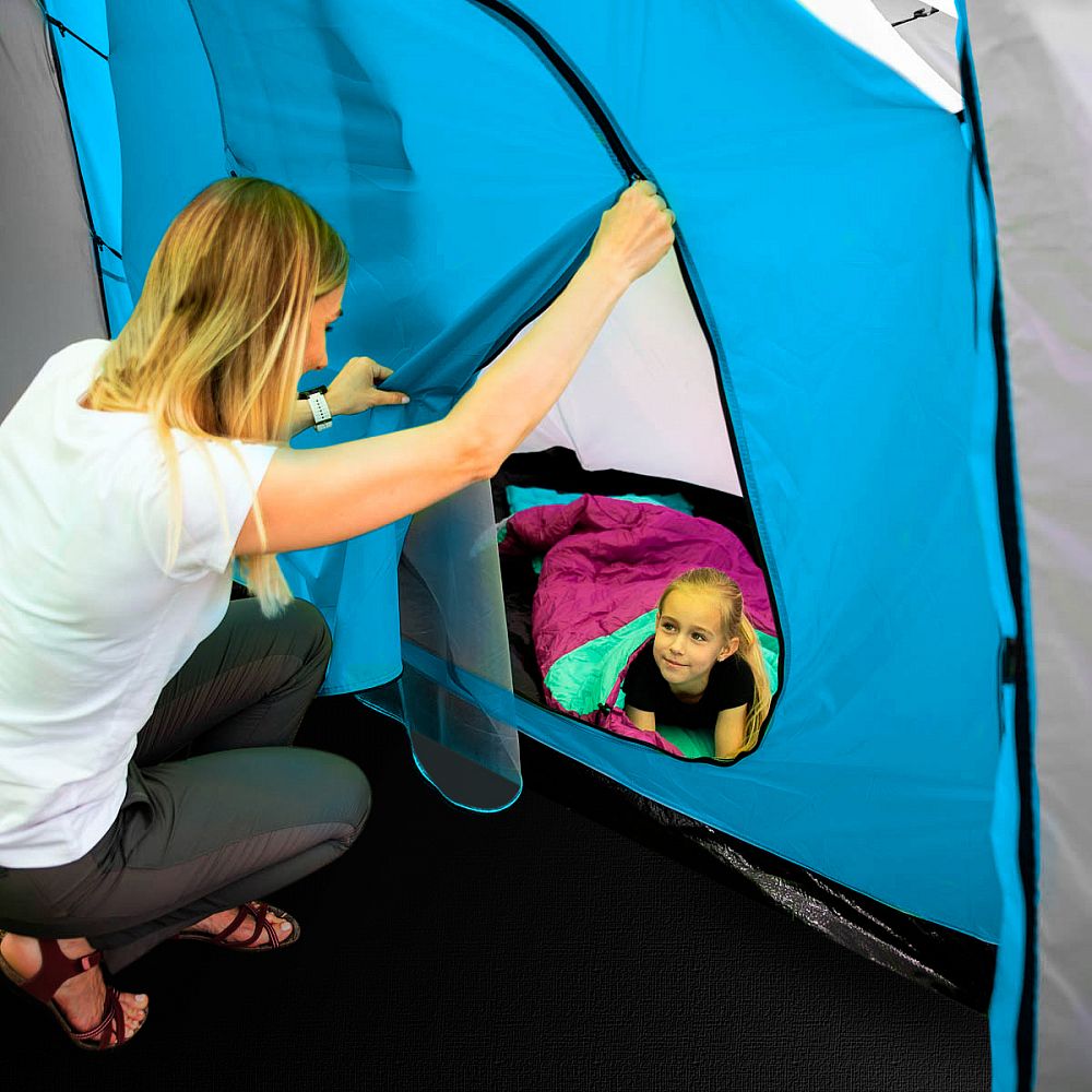 Vysoký komfort odpočinku v náročných povětrnostních podmínkách zajišťuje nepromokavá plachta a podlaha s voděodolnou úpravou do 4000 mm H2O.