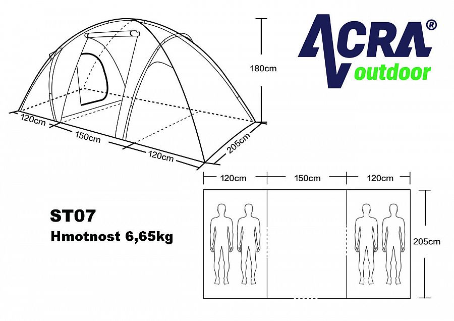 Stan rodinný- rozměry: (120+140+120 cm - šířka stanu - obě ložnice + předsíňka) x 205 cm (hloubka stanu) x 180/135 cm (výška stanu v předsíňce, nižší výška je pro prostor nad ložnicemi)