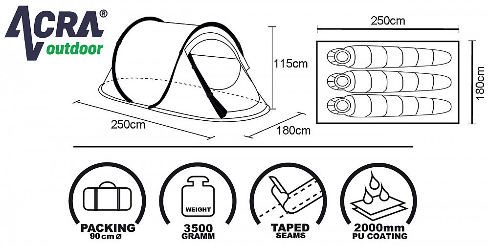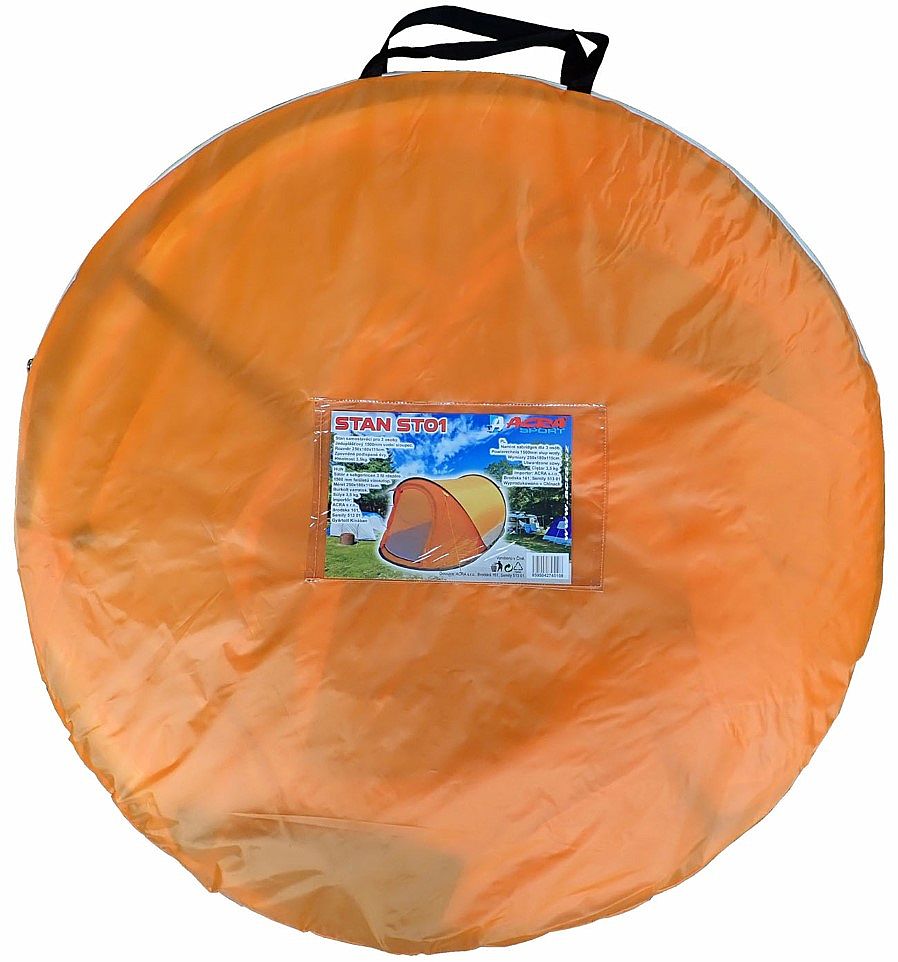Samostavěcí stan má zpevněné a podlepené švy, které brání proniknutí vody, impregnace je 1500 mm vodního sloupce, hmotnost stanu je 3,5 kg. Sbalený stan zabere minimum prostoru. Stan stačí vyndat z obalu, hodit na zem a on se sám postaví díky pružným sklolaminátovým nosným prutům. U stanu je přibalené návod s postupen na skládání a rozkládaní stanu. Rozměr pro přepravu 90 x 90 x 3 cm.