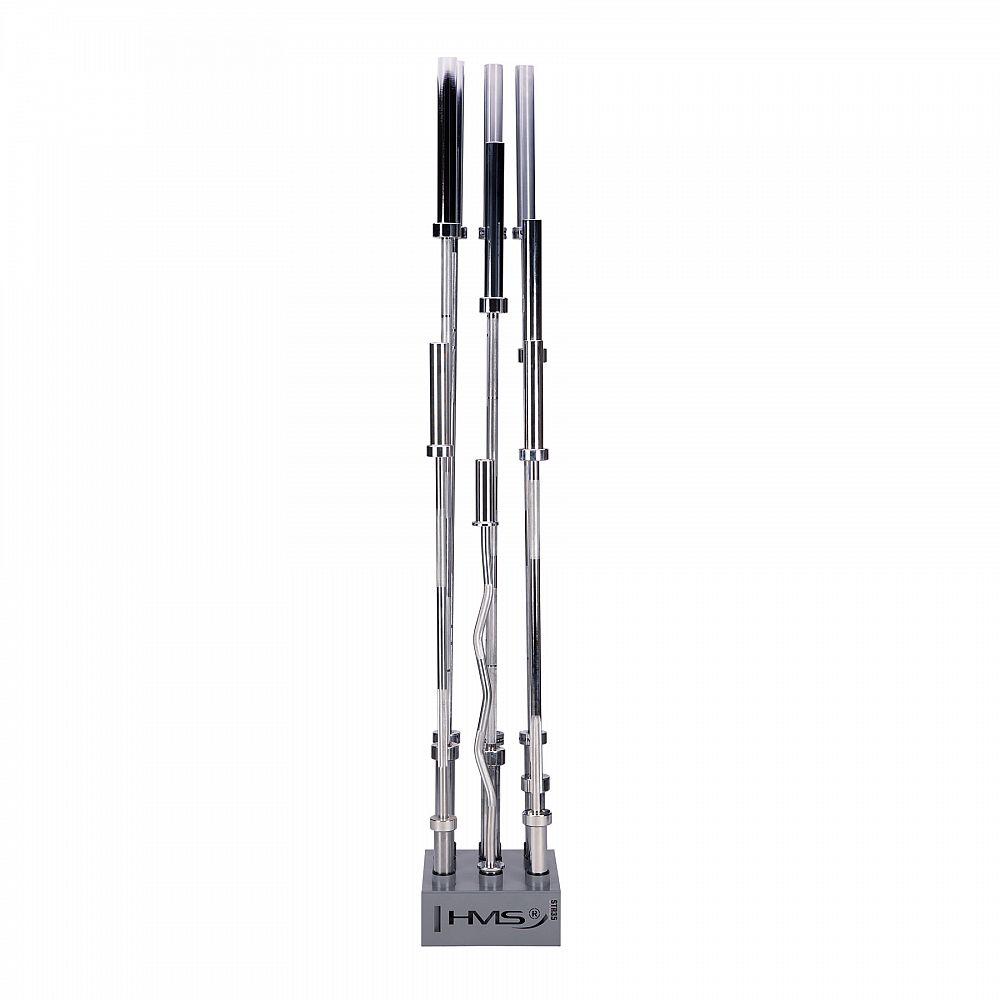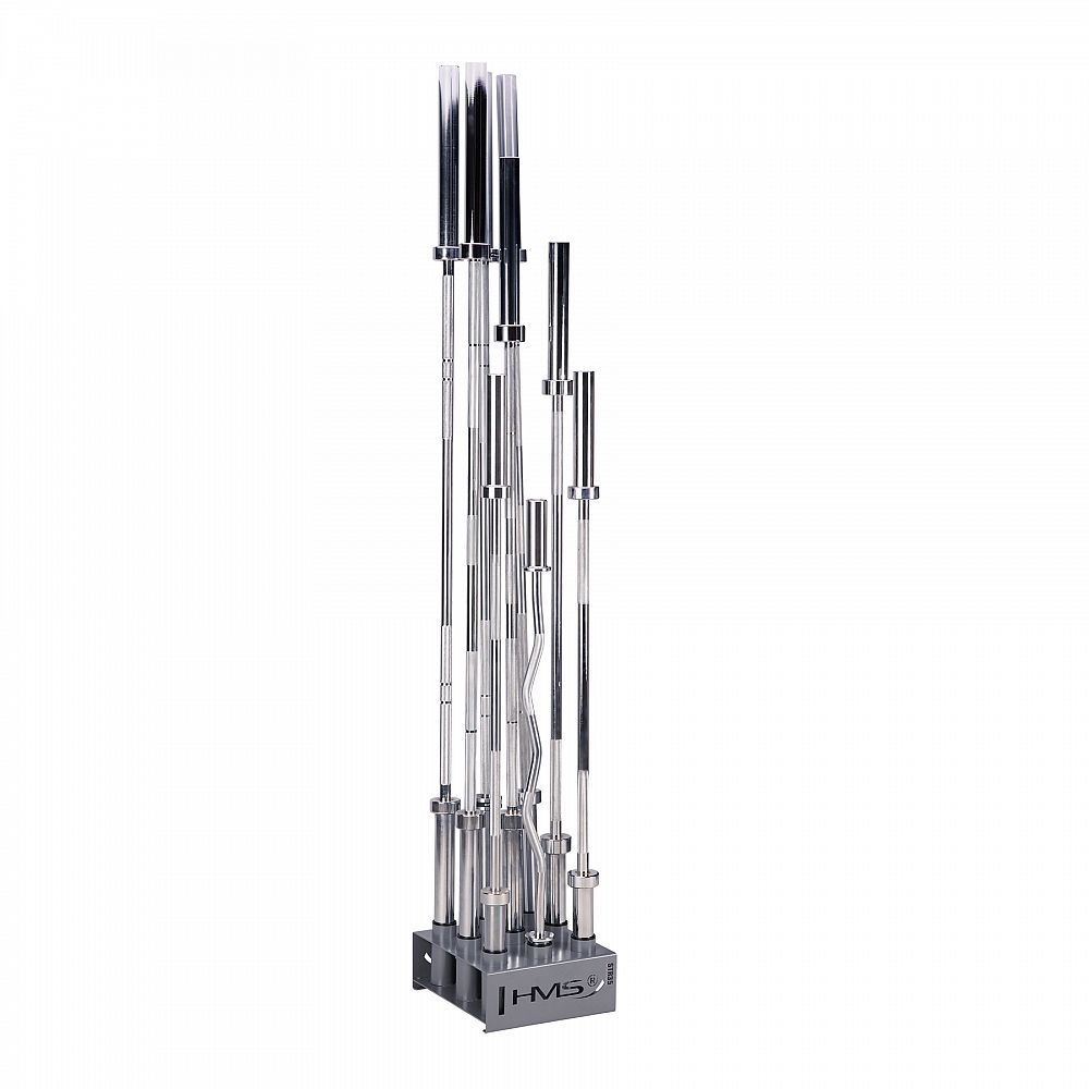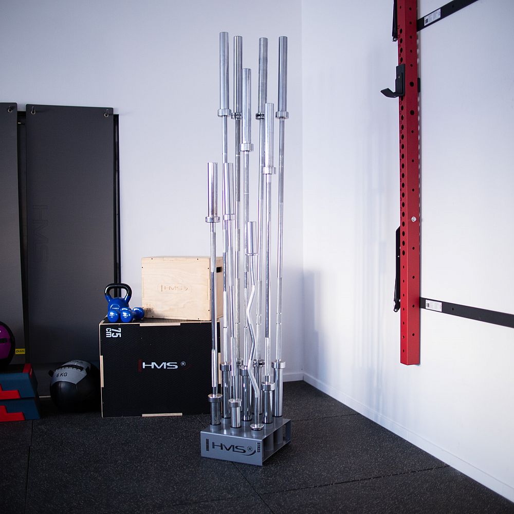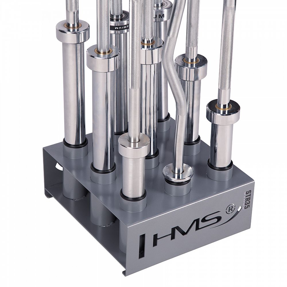 Stojan na olympijské osy STR35 od společnosti HMS vám ušetří spoustu místa ve vašem tréninkovém prostoru. Umožňuje postavit devět os vedle sebe ve svislé poloze.