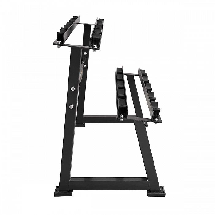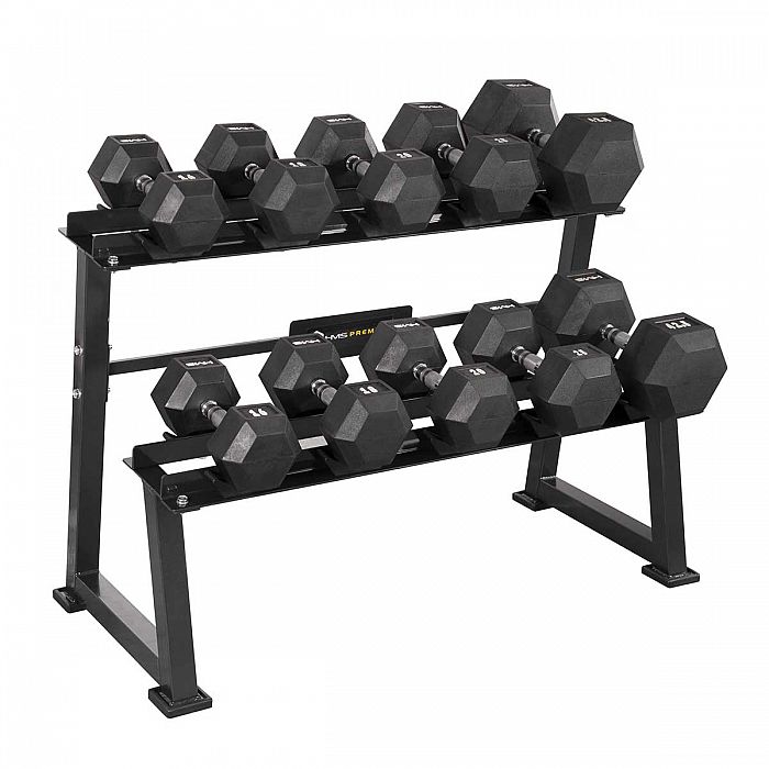 Stojan na jednoruční činky HMS Premium STR21 je ideálním pomocníkem pro uložení 5-ti párů činek. Kvalitní, ocelová konstrukce ja vyrobena z profilu 50 x 50 mm, díky tomu unese zatížení až 500 kilogramů. Stojan STR21 má dvě "kolejnice" o rozměru 122 x 22 centimetrů, které jsou umístěny nad sebou pro snadnou orientaci mezi odkládaným náčiním. Ke každé polici jsou připevněny profilované, gumové podložky, do kterých se ukládají jednotlivé činky. Guma zamezuje pohybu činky a zároveň ji chrání před poškozením. Čtyři nohy stojanu jsou opatřeny gumovými patkami, které chrání podlahu před jejím poškozením.