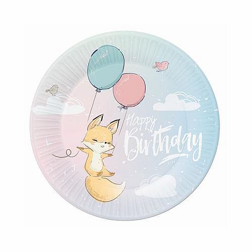 Party talíře Pastel Animals s nápisem Happy Birthday.