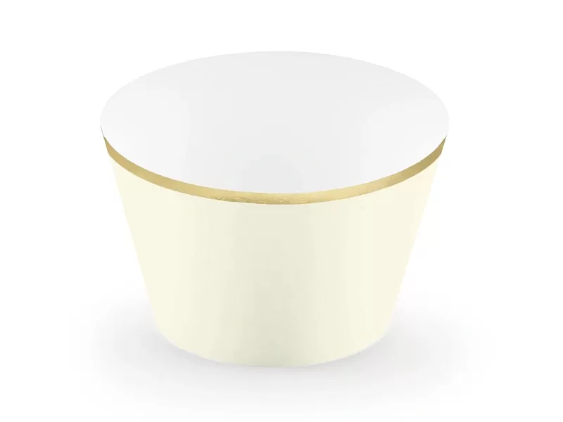 Papírová košíček na cupcake ve světle krémové barvě se zlatým okrajem po sestavení cca 4,8x7.6x4,6cm.