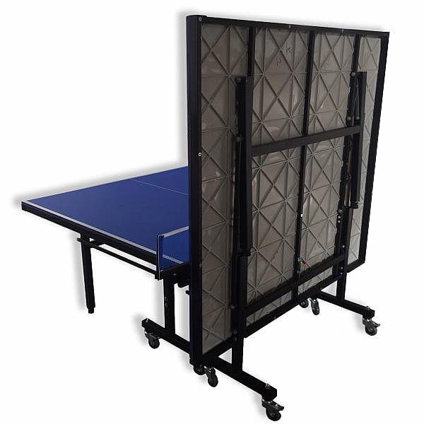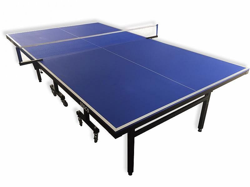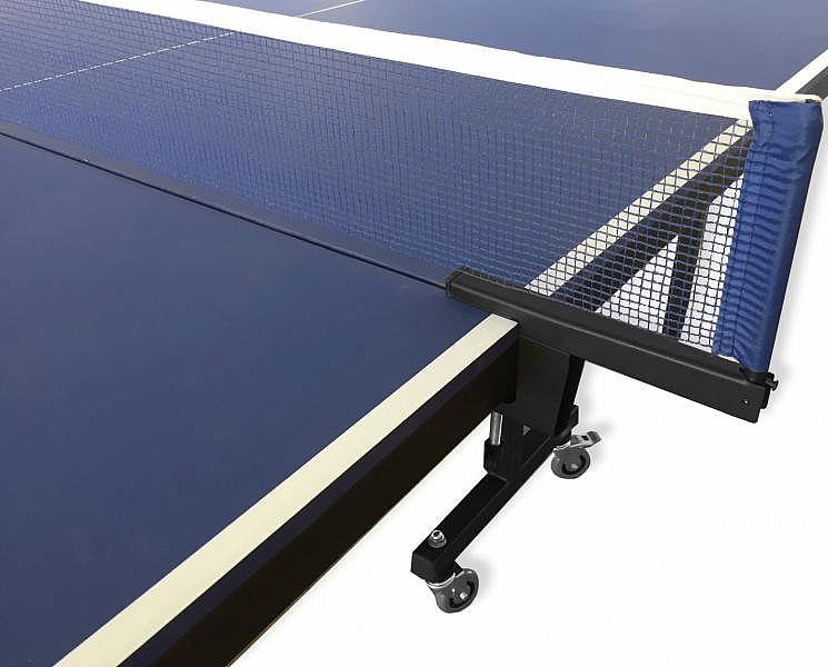 Je vyroben s deskou SMC o síle 14MM - modré barvy. Deska je opatřena speciální povrchovou úpravou, která odolává vlhkosti a stůl je vhodný pro vnitřní i venkovní použití. Stůl má 4 pojezdovové podstavce s kolečky o průměru 75 mm. Je opatřen bezpečnostním systémem, který zabraňuje sklopení stolu, pokud je ve svislé poloze. Konstrukce stolu je z ocelových profilů 40x40mm opatřeno antikorozním nátěrem. Síťka ke stolu součástí balení